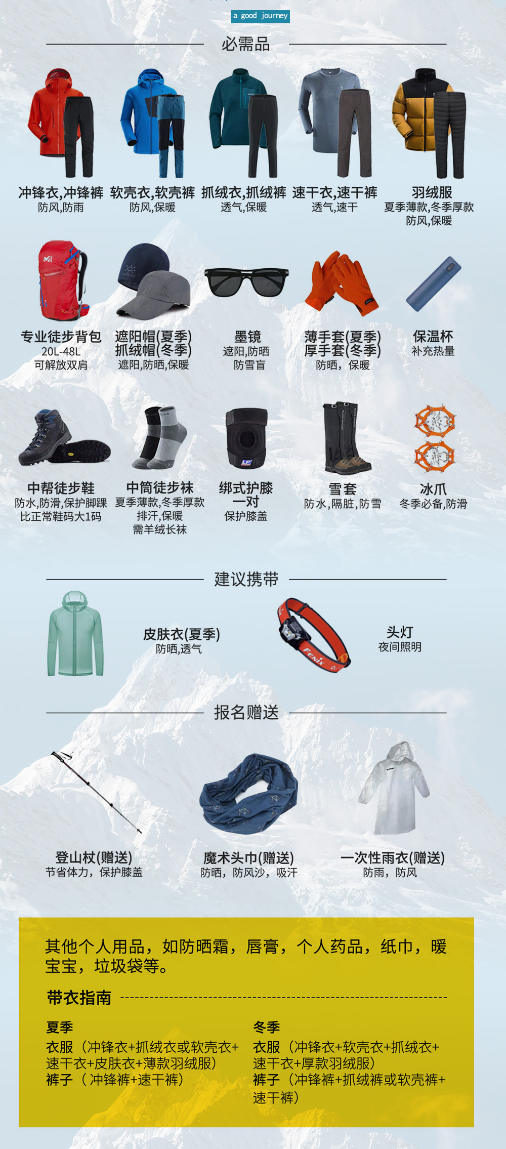 手足装备:防水防滑的中高帮徒步鞋、速干袜、户外手套、雪套(下雨天防止打湿、弄脏裤脚/鞋子)、冰爪(冬季团期需要)等;