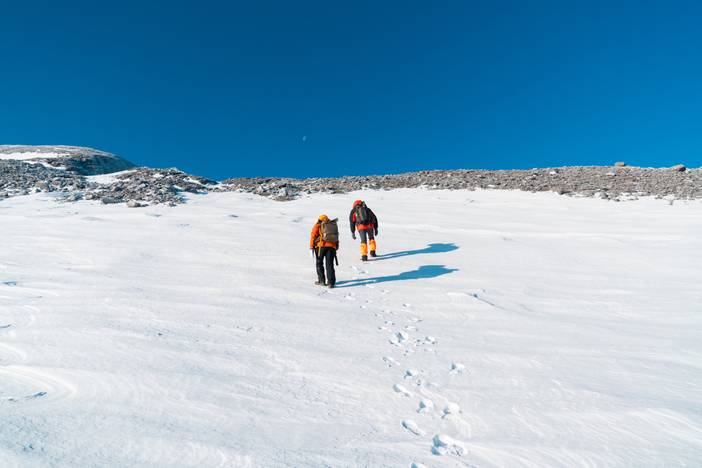 早上9点吃早餐,随后从哈巴客栈出发,途经小草坪、大草坪,穿越干河,抵达哈巴大本营(海拔4080)。在大本营吃完晚餐后,高山向导会为队员整理好冰爪冰镐等物资。整理背包后,大家就寝。