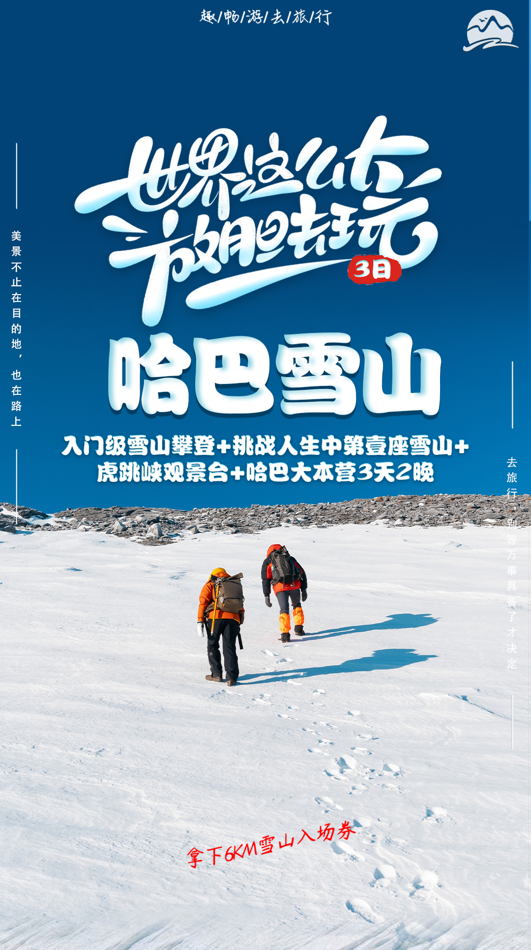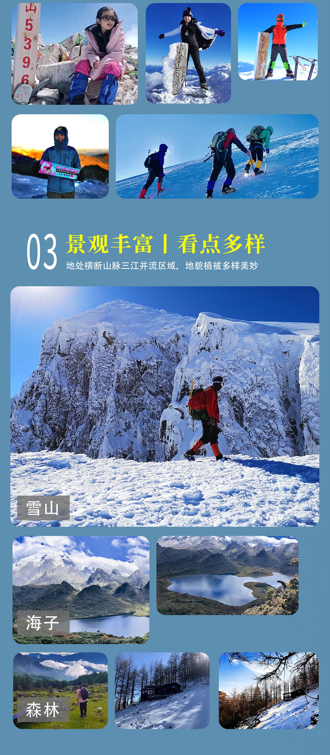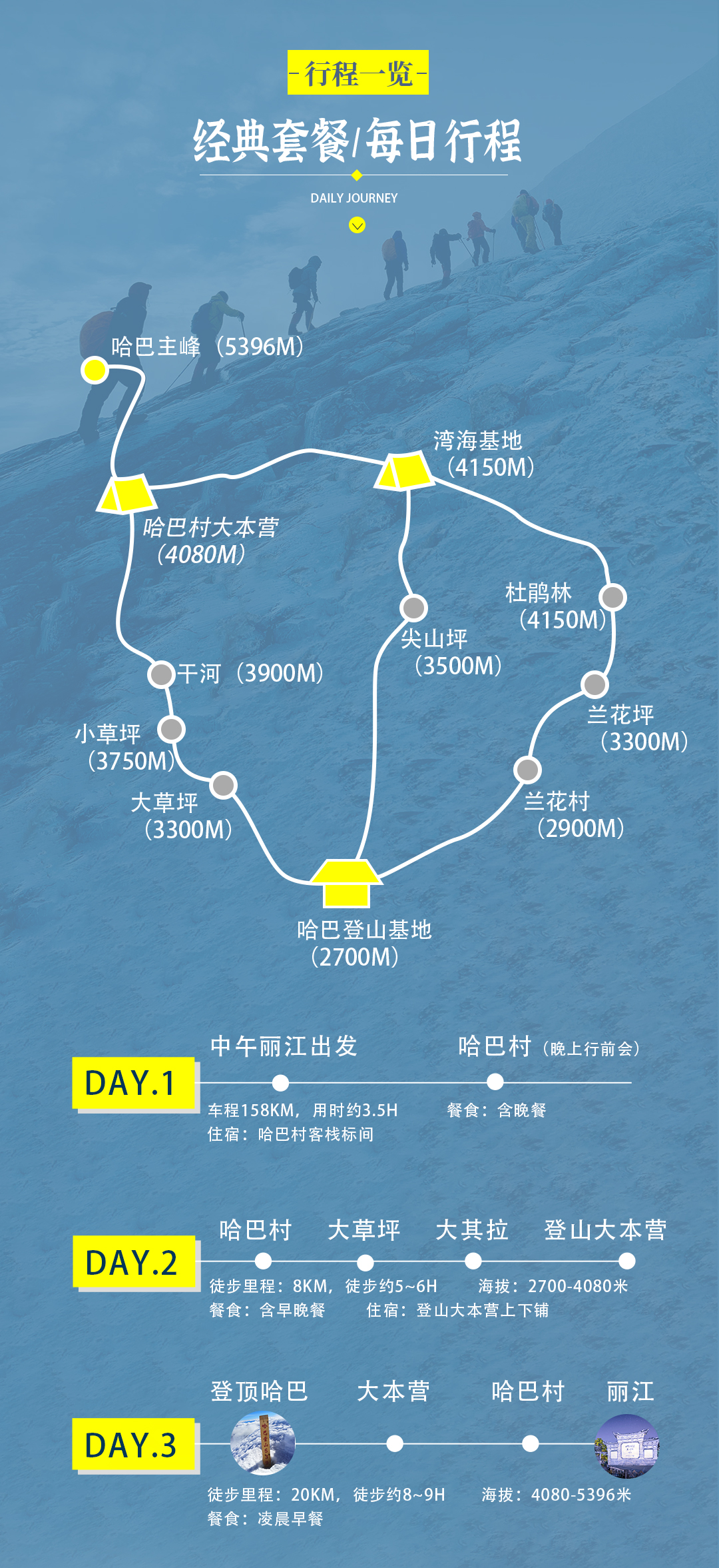 1、重要提示:哈巴雪山登山为高原登山活动,请大家对自己身体情况做出正确评估后以决定是否适合参加,原则上需要提供县级以上公立医院体检报告方可报名,报名前请将实际状况告知客服,如有隐瞒等情况,造成后果一律自负;