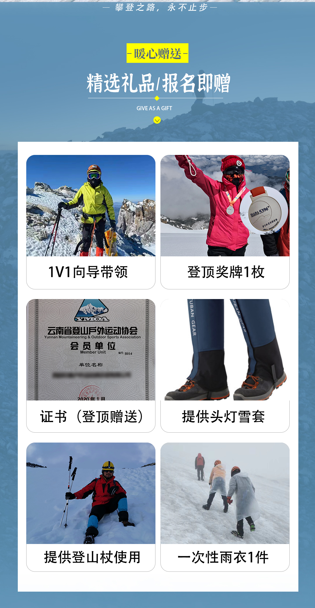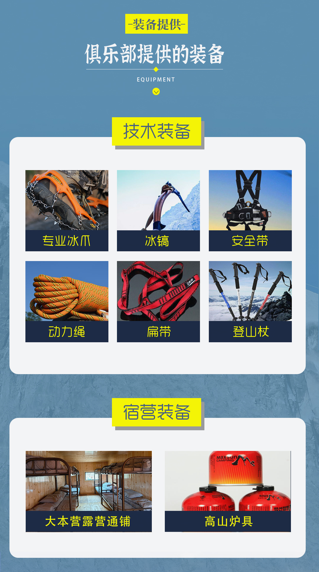 4、技术装备:提供登山杖、冰爪、冰镐、头盔等等技术类装备;