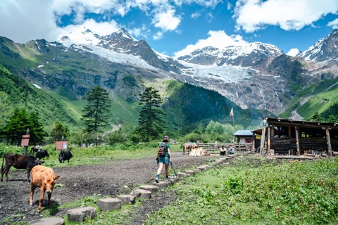清晨用完早餐后,从住宿地出发,经高海拔原始森林及杜鹃丛林,徒步将近2小时后翻过海拔3900米的上那宗拉丫口,直至雨崩河河底,