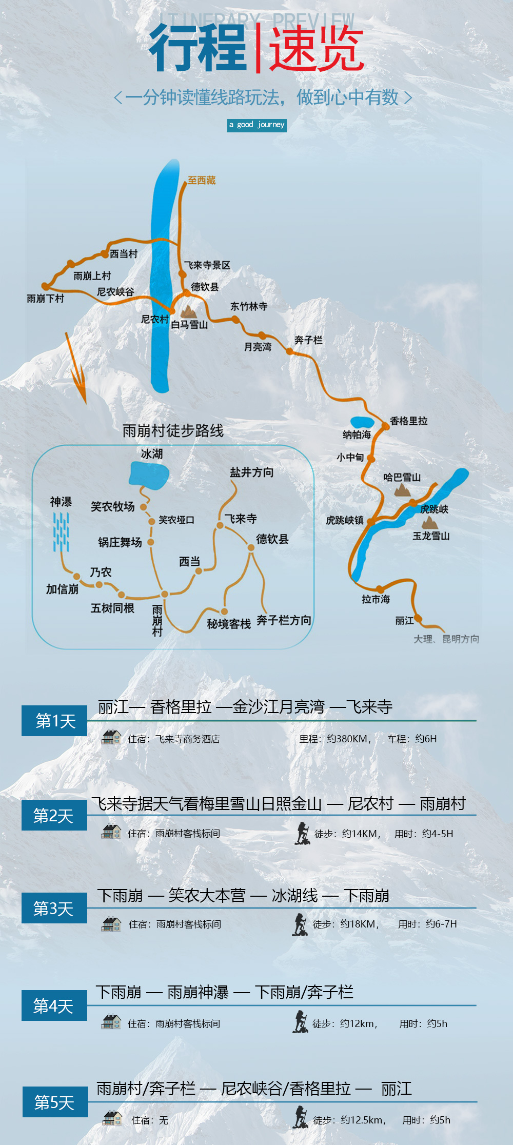 丽江—金沙江月亮湾—奔子栏—白马雪山垭口(海拔4292米)—梅里雪山(飞来寺)