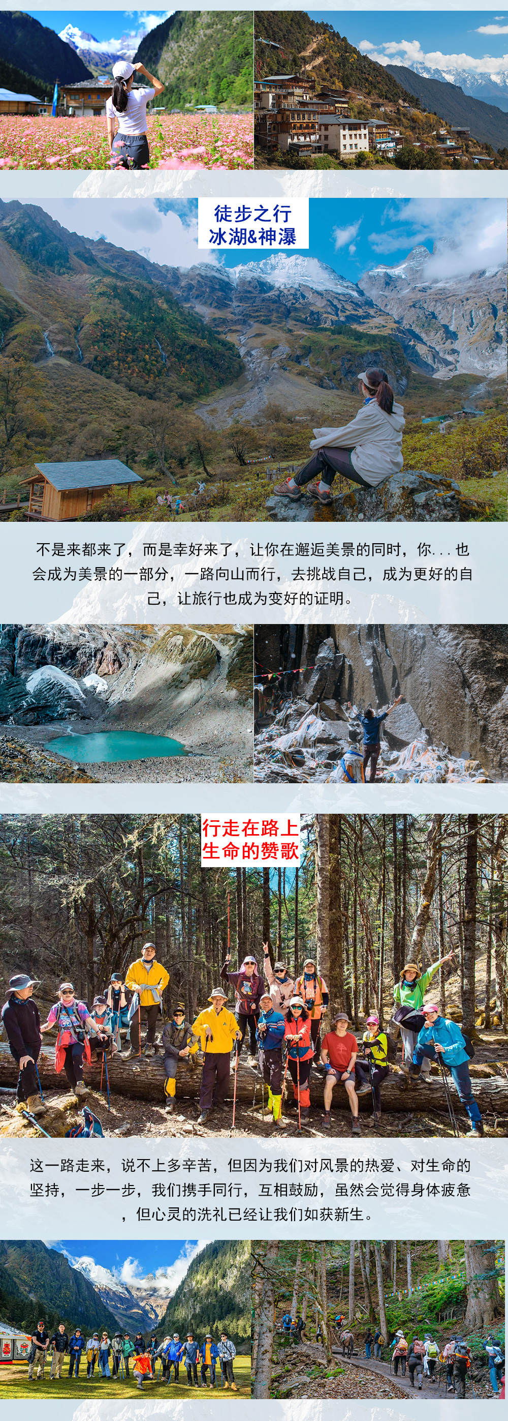 "在笑农大本营,享用美味的午餐,稍作休息,为接下来的旅程补充体力。继续前行,终于抵达冰湖,湖光山色交相辉映,宁静而神秘的氛围令人陶醉。最后,踏上归程,回到雨崩村,深入体验当地独特的民俗文化,感受浓厚的人文气息