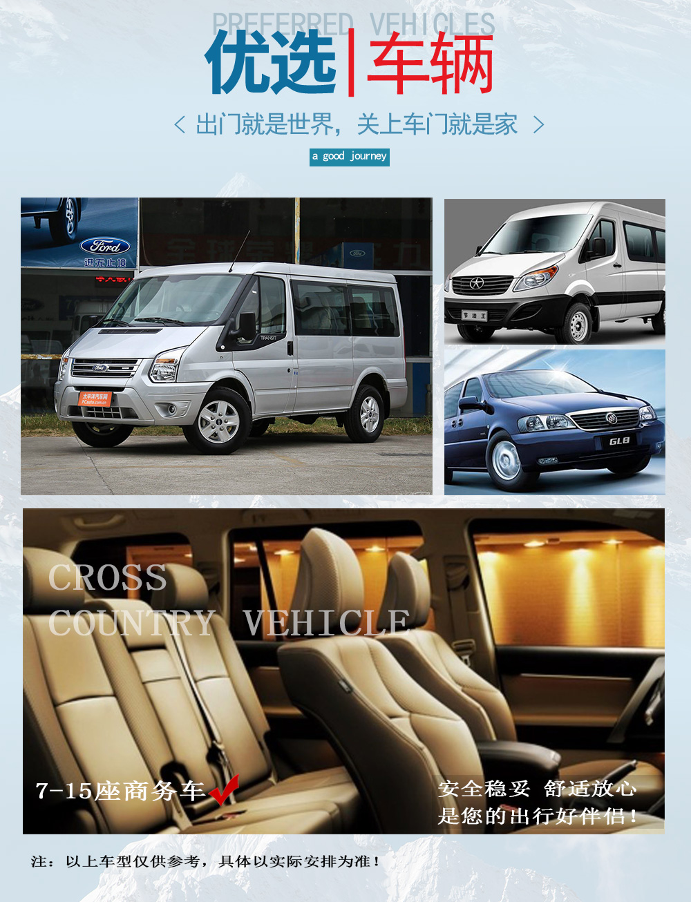 1、交通:根据人数选择合适车型,一人一座。(①行程内旅游用车、路桥油费);