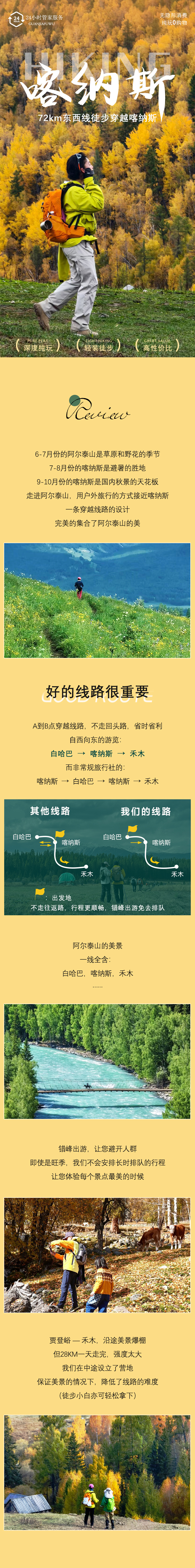 6-7月份的阿尔泰山是草原和野花的季节,7-8月份的喀纳斯是避暑的胜地,9-10月份的喀纳斯是国内秋景的天花板。走进阿尔泰山,用户外旅行的方式接近喀纳斯,一条穿越线路的设计,完美的集合了阿尔泰山的美!
