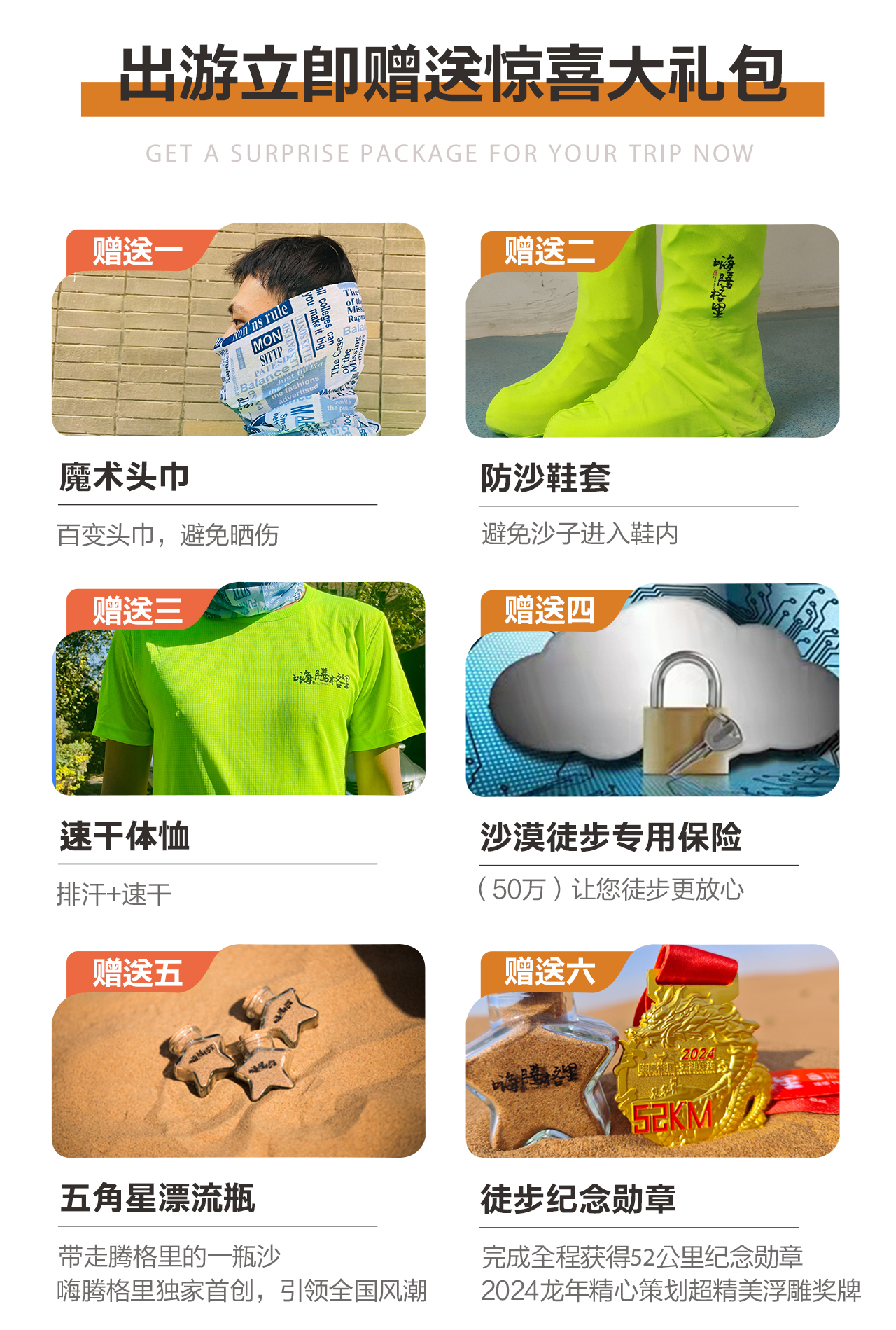 01 此腾格里徒步活动不同于传统旅游线路,对参加队员的安全、环保和团队协作精神要求较高,要求体现中华传统美德。全程徒步过程中,严禁丢弃任何不可降解垃圾,组委会提供大型编织袋垃圾袋,所有垃圾请归拢至垃圾袋,由物资车统一运出沙漠。