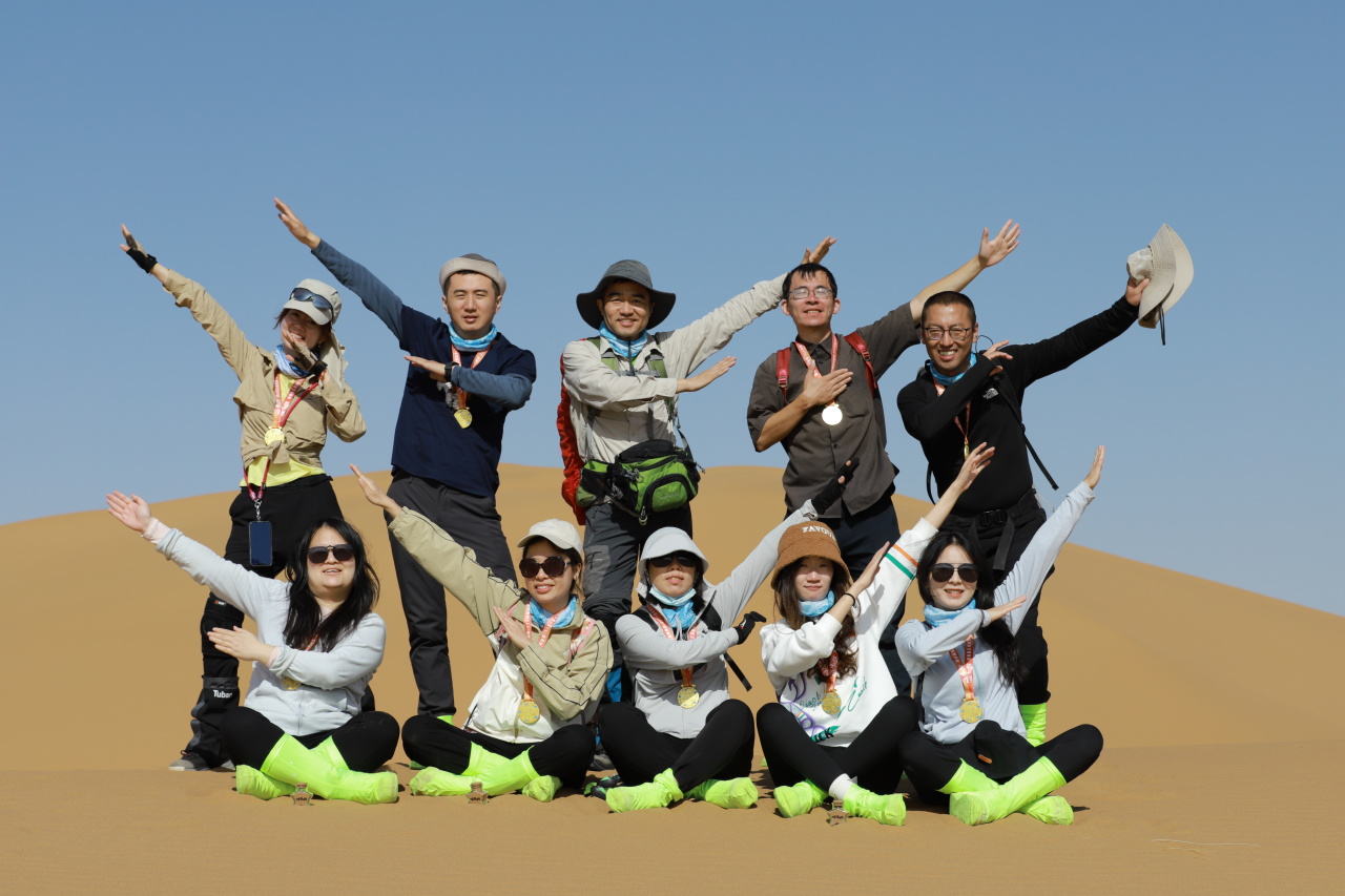 今日沿途可远眺月亮湖(不进入湖内),碧绿湖水、漫漫黄沙、蔚蓝天空在这里交织成一个美妙的画卷,继续行走10公里到达终点! 领队在终点为大家颁发奖牌,集沙瓶,合影留念;午餐过后,大家一起返回银川解散。
