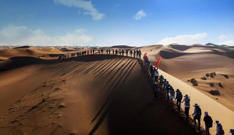 午餐之后,预计13:30左右抵达徒步起点,分发沙套、魔术头巾、登山杖等物资,之后跟随领队在沙漠徒步起点处开始做热身运动,今日徒步全天行程15公里,匀速5-6小时即可到达营地,夜宿小天鹅湖营地。