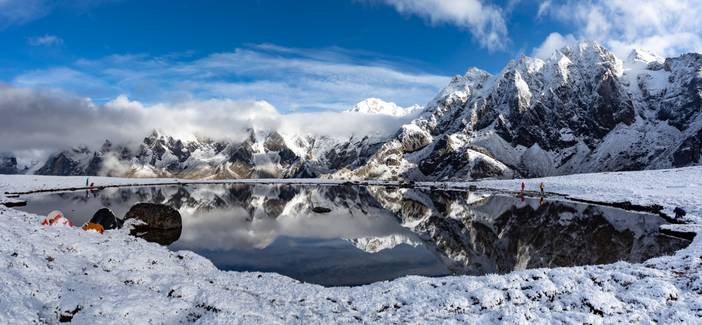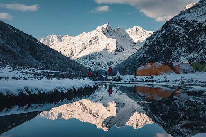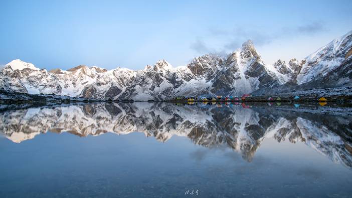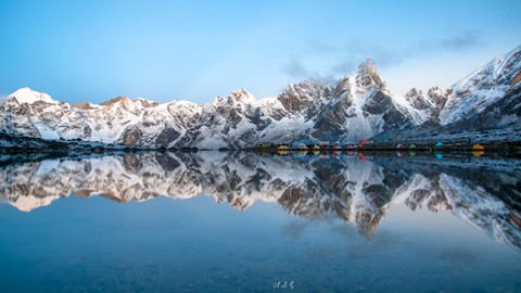 (徒步第5天)在珠峰东坡的徒步行程中,措雪仁玛绝对是每一个来这里的徒步者都满怀期待的地方。它是整个行程中海拔最高的营地,也是同时与喜马拉雅山脉中的三座8000米的雪山近距离接触的地方,珠峰(世界第一)、洛子峰(世界第四)、马卡鲁峰(世界第五)。而在这三座8000米的世界级雪山以及其他7000米以上的雪山下面又刚刚好有这样一个湖泊,可以同时倒影它们的身影。不管是湖边营地看看日出日落照耀下的雪山湖泊,还是晒晒太阳喝茶聊天,或者在营地周围走走看看拍拍照,总能找到你一辈子都忘不了的角度,尽情的享受这一天。