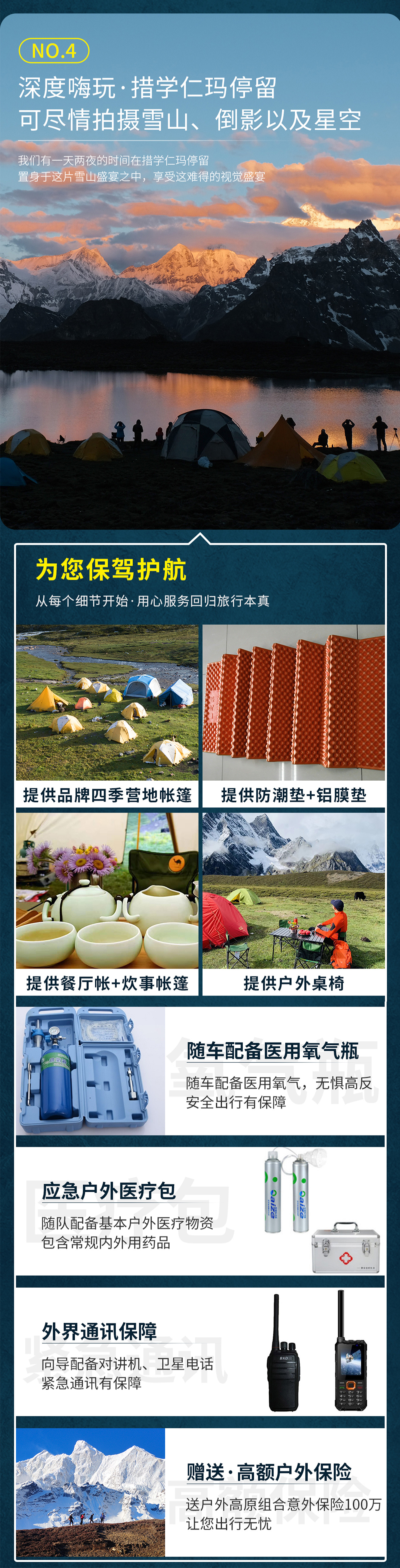 意外保障:高保额户外专项保险、第一现场救援下撤支持、医用氧气、医药包。