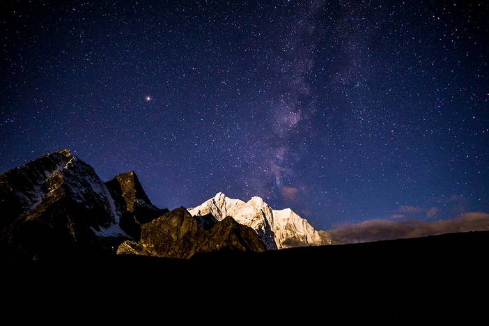 (徒步第2天)早起用餐,天气好的话我们将看到马卡鲁和珠穆郎卓的日照金山以及它们在晓乌错的倒影!此处是整个行程中观看马卡鲁峰的最佳地点之一。中午翻越晓乌拉垭口(4880米),陡坡下降到嘎玛沟的起点卓湘(3950米)山谷地带。一路感受植被的变化。下午沿谷行走,抵达营地兰花谷(兰花谷是通往珠峰东坡和嘎玛沟的分路点)。