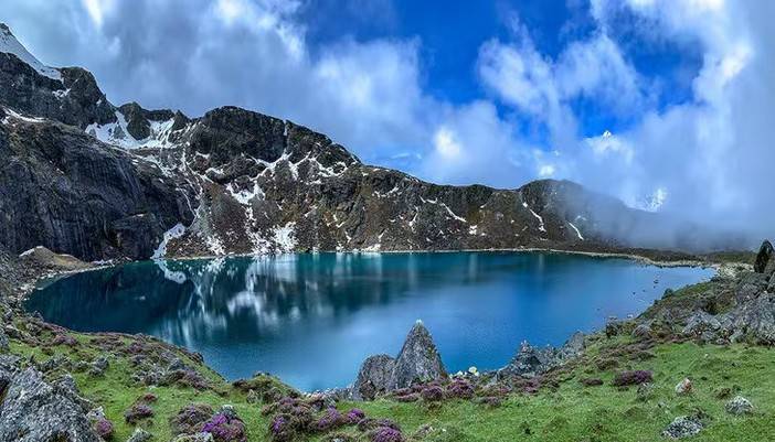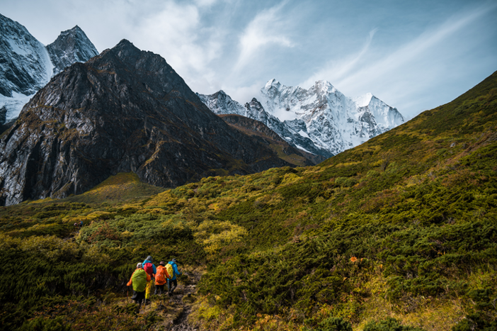 (徒步第3天)从卓湘兰花谷沿原始森林上行,植被垂直分布状态明显,到达山脊后可俯瞰嘎玛沟全貌,如果有缘更可以邂逅马卡鲁峰(8463米)。中午到达雪山怀抱的措朗湖。湖水经过一个泄水口注入嘎玛沟内,措郎山谷两端雪山相映。午后翻过一个垭口就到达了野花灿烂的夏侬牧场,然后一路都比较平坦,一直到达今天的营地汤湘观景台营地(营地因天气、季节可能会灵活调整,具体根据领队实际安排为准)。