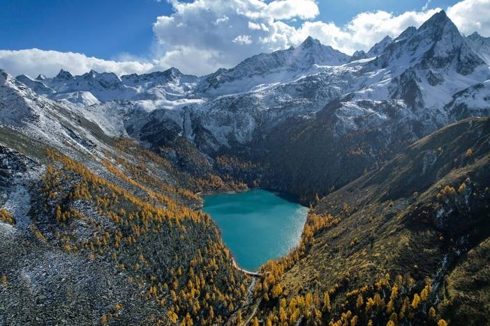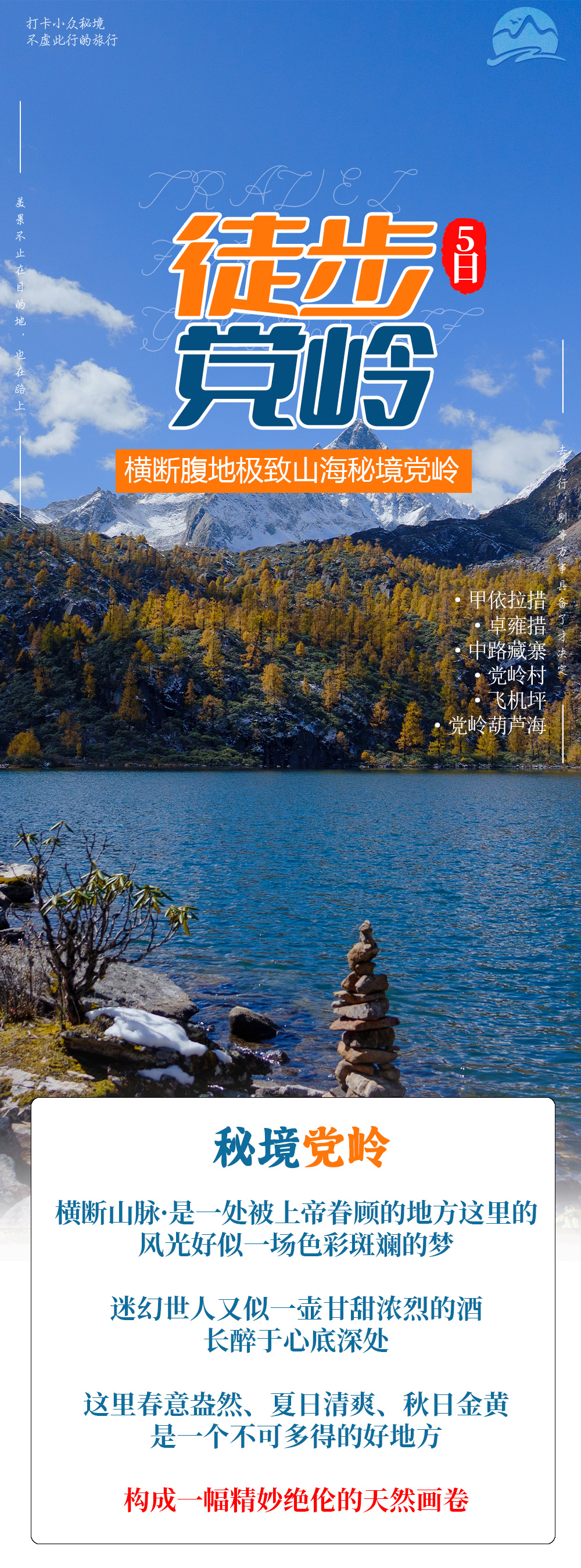 早晨可自愿选择前往观景台欣赏藏寨全景,清晨的藏寨、云雾、光线共同构建了一幅幅水墨之境。早餐之后乘车前往党岭村,徒步前往甲依拉措,一个鲜为人知的小众秘境,湖水的颜色随季节而变化,夏秋季节的时候湖水呈现乳白色,所以当地又称之为牛奶海。甲依拉措是一个雪山 、落叶松、杜鹃花怀抱的高山湖泊,与葫芦海为姊妹湖,隔山相望。湖边停留休息后我们开始沿河谷下撤回到公路旁返回党岭村。