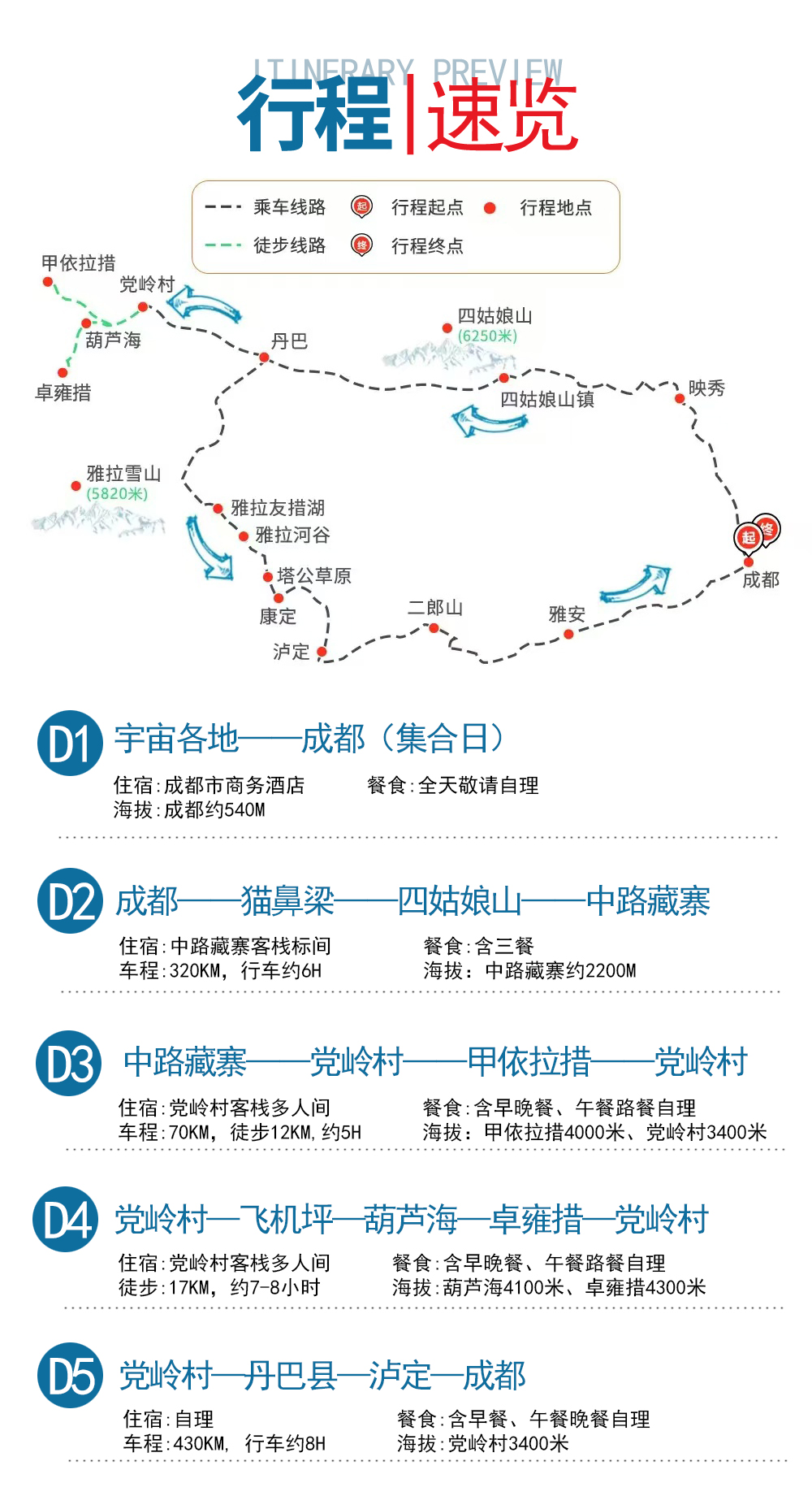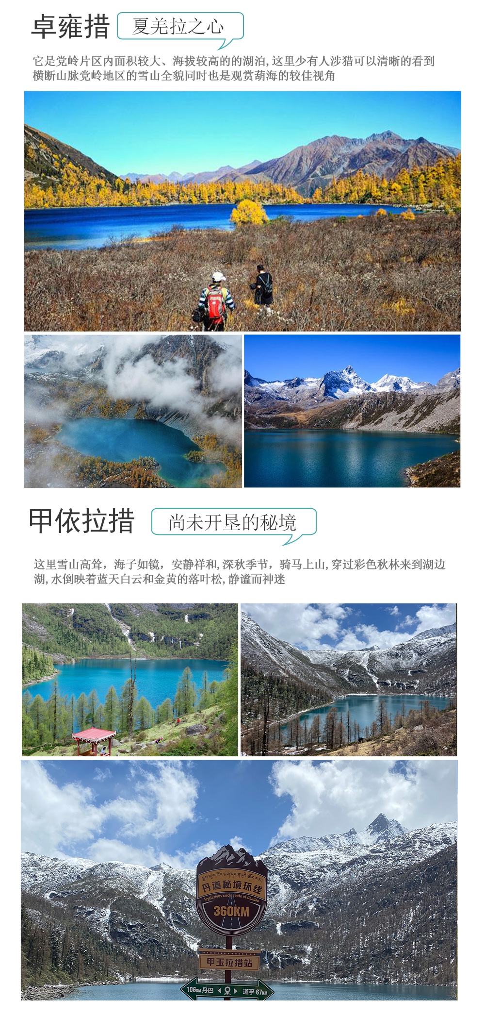 (1)全程徒步约29公里左右,平均海拔为3600米左右,徒步最高海拔为卓雍措4300米(也可只上到葫芦海4100米),住宿最高海拔为党岭村3400米左右.