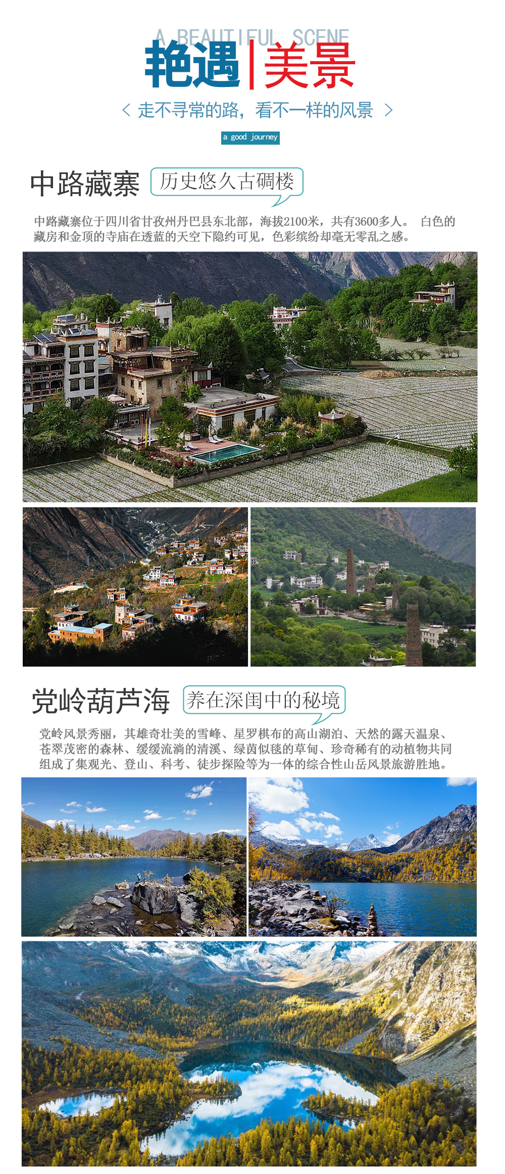 2、入住“千碉之国”--中路藏寨,感受嘉绒藏乡风情~看夏羌拉雪山、梦幻的葫芦海、碧玉般的甲依拉措以及深在闺中的卓雍措……