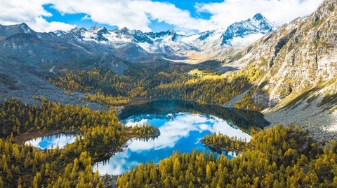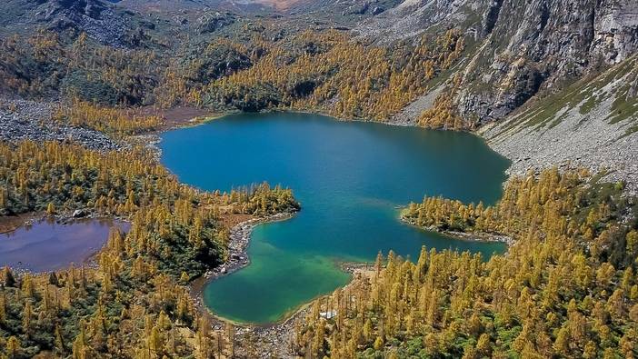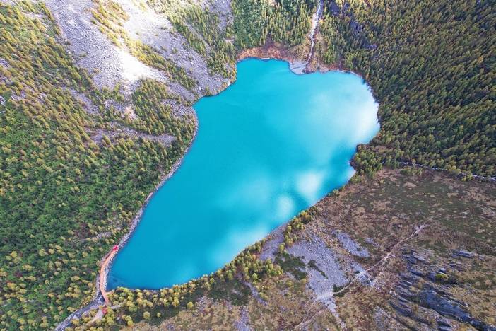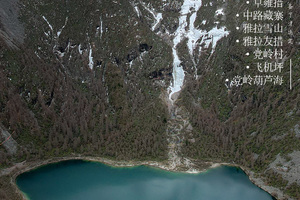 雅拉雪山雪线下是浩瀚稀有的红杉木原始森林,穿越线路中有大片大片的沙棘林带。山腰下有各具特色的雅拉友措(又叫玉石海,俗称小海子,海拔3980米),垭拉措和镇朗措(又名姐妹湖,俗称大海子,海拔4200米)三个高山海子。