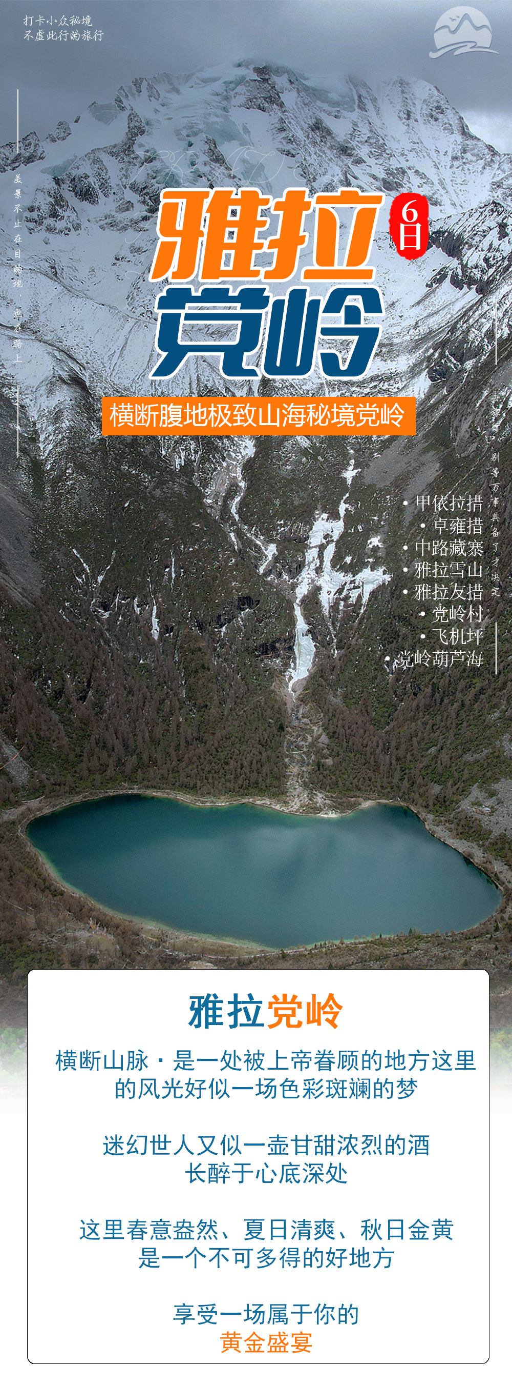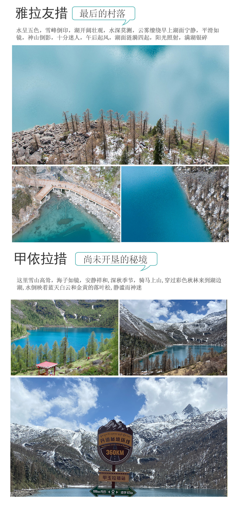 2、从嘉绒到康巴的极致穿越,自然风光上有圣洁的雅拉神山、静谧的雅拉友措,还有壮观的党岭夏羌拉雪山、梦幻的葫芦海、碧玉般的甲依拉措以及深在闺中的卓雍措……