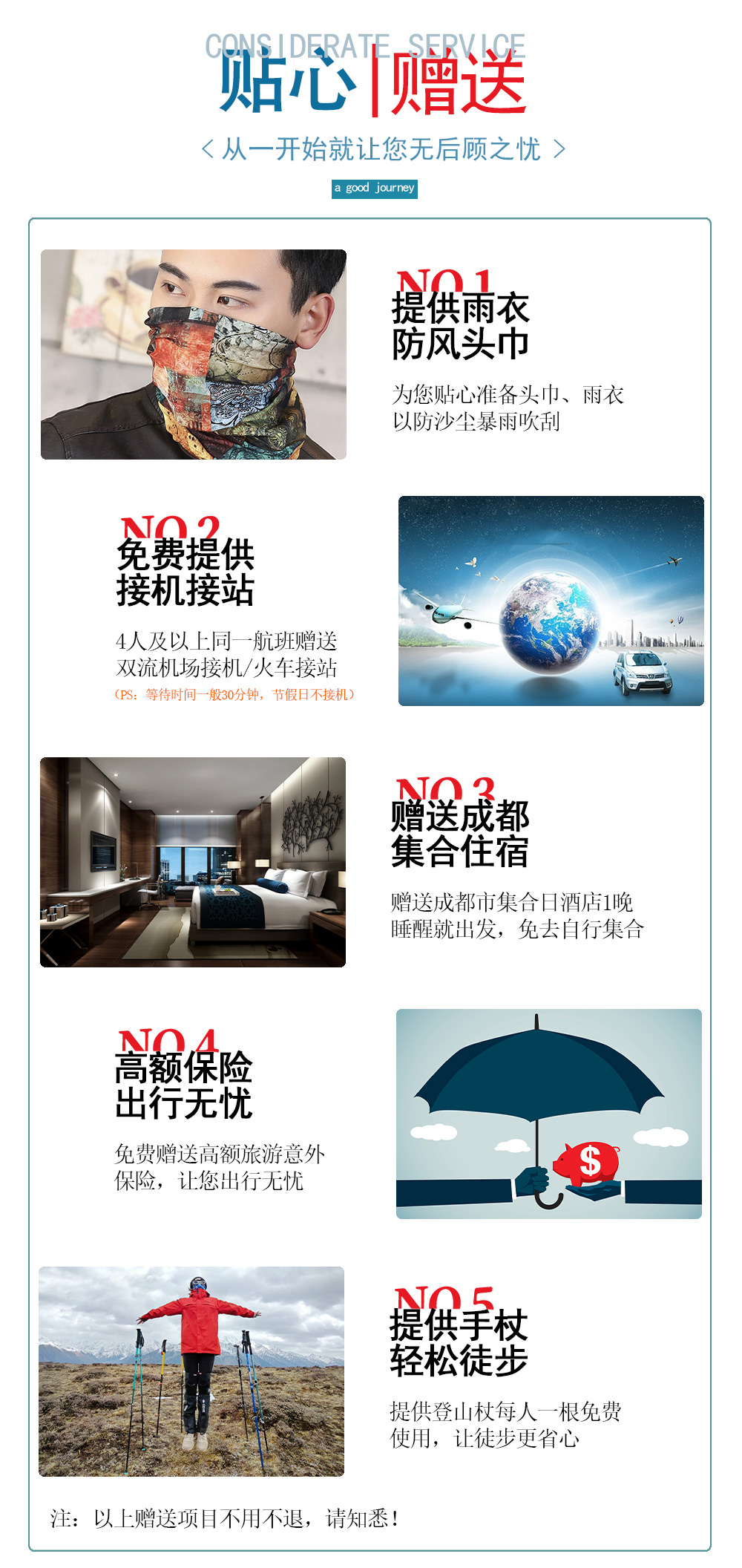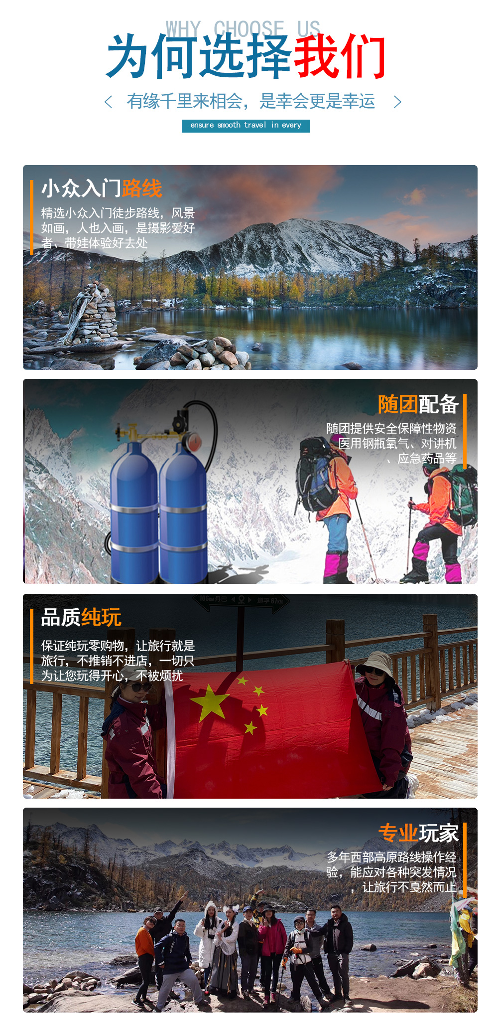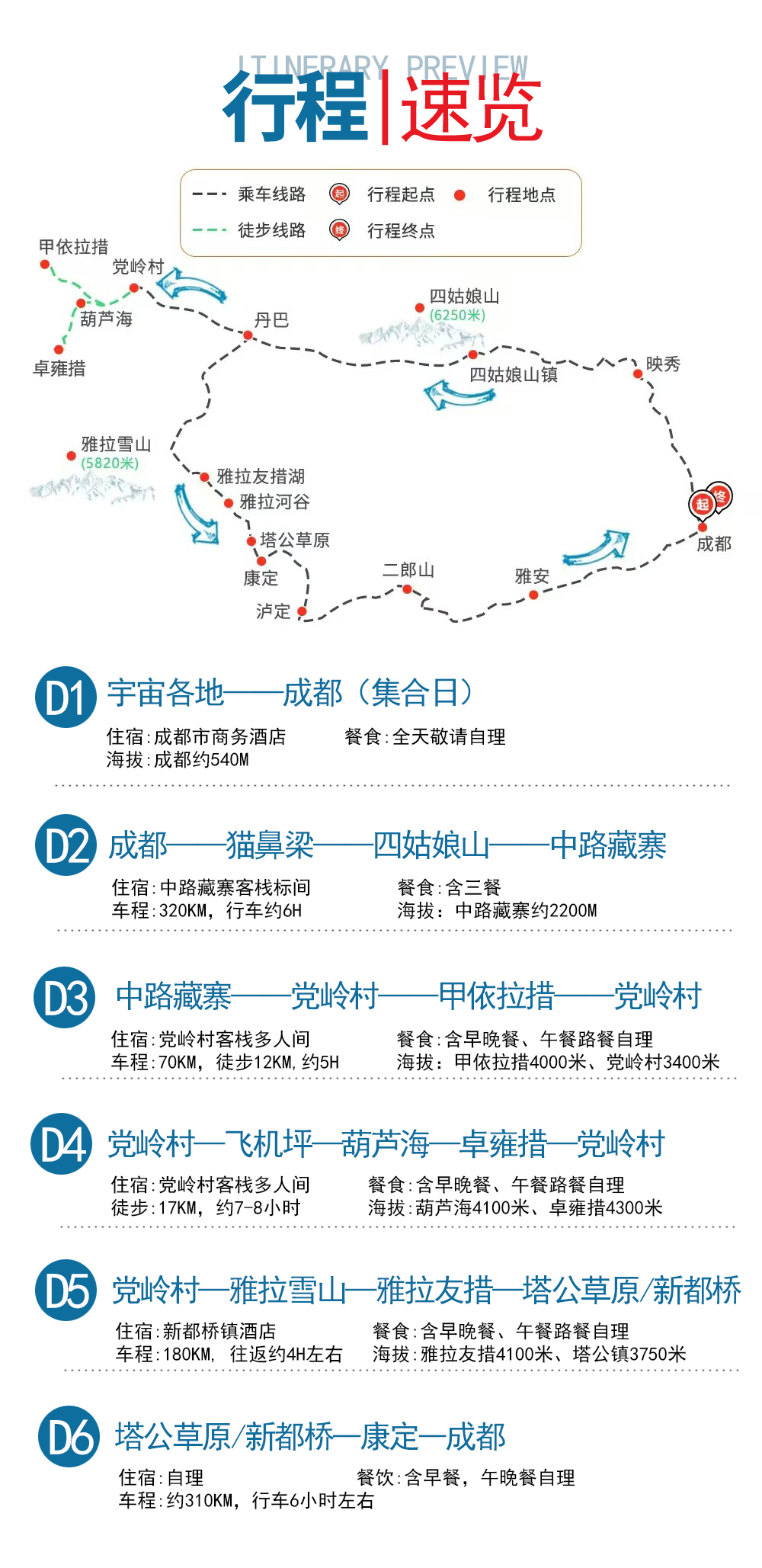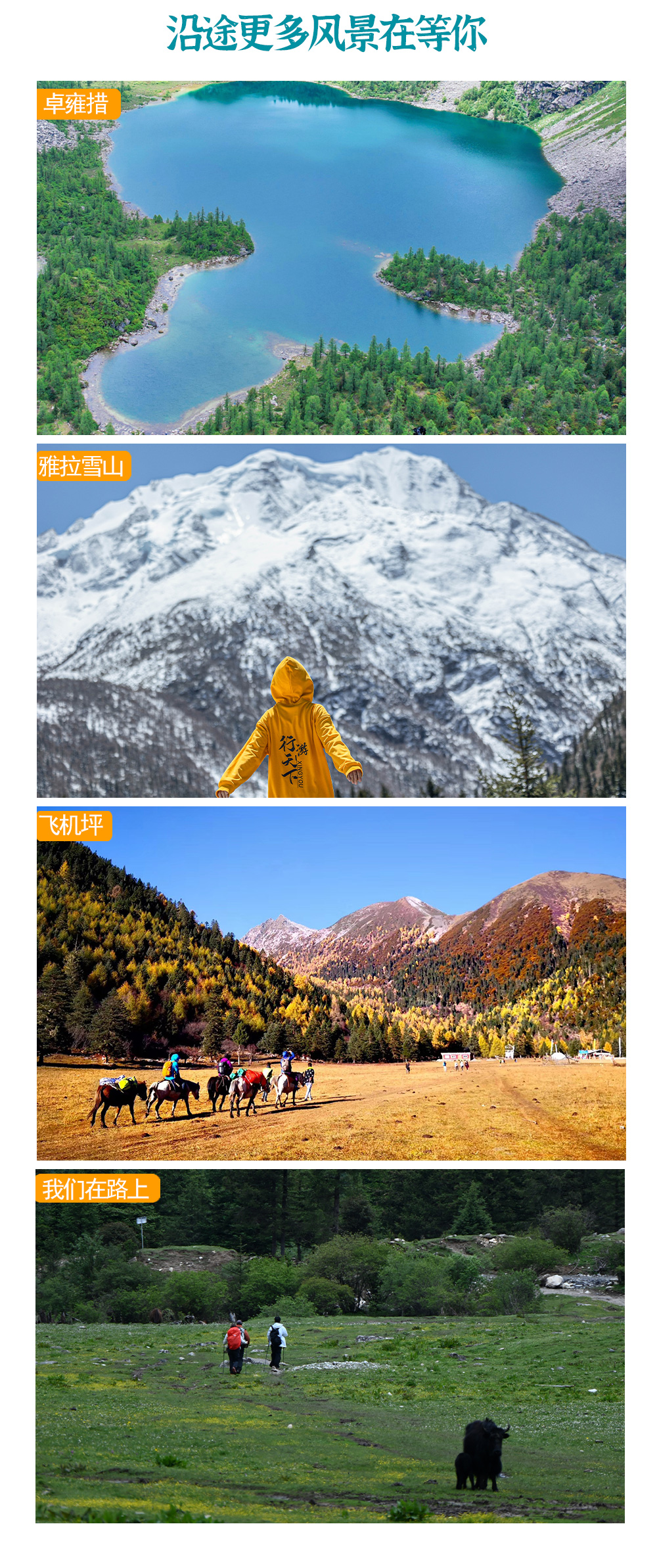 (1)全程徒步约32公里左右,平均海拔为3600米左右,徒步最高海拔为雅拉友措4100米,住宿最高海拔为党岭村3400米左右。