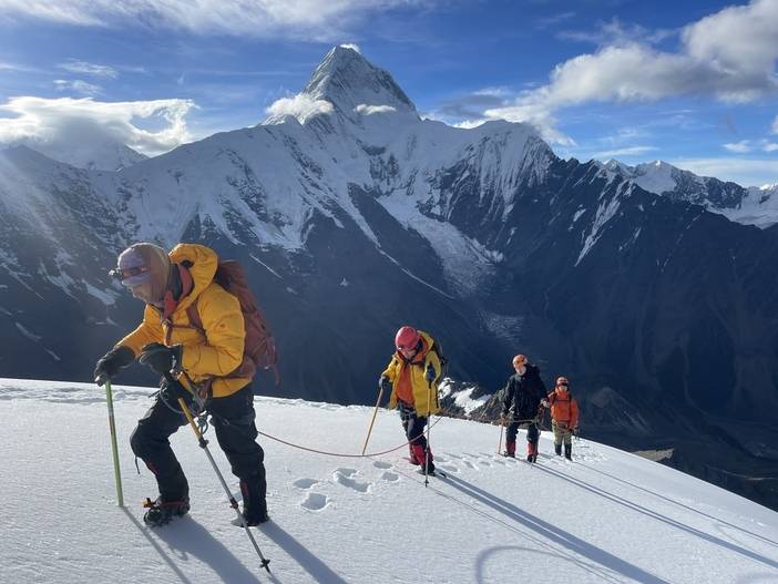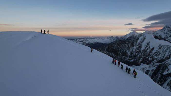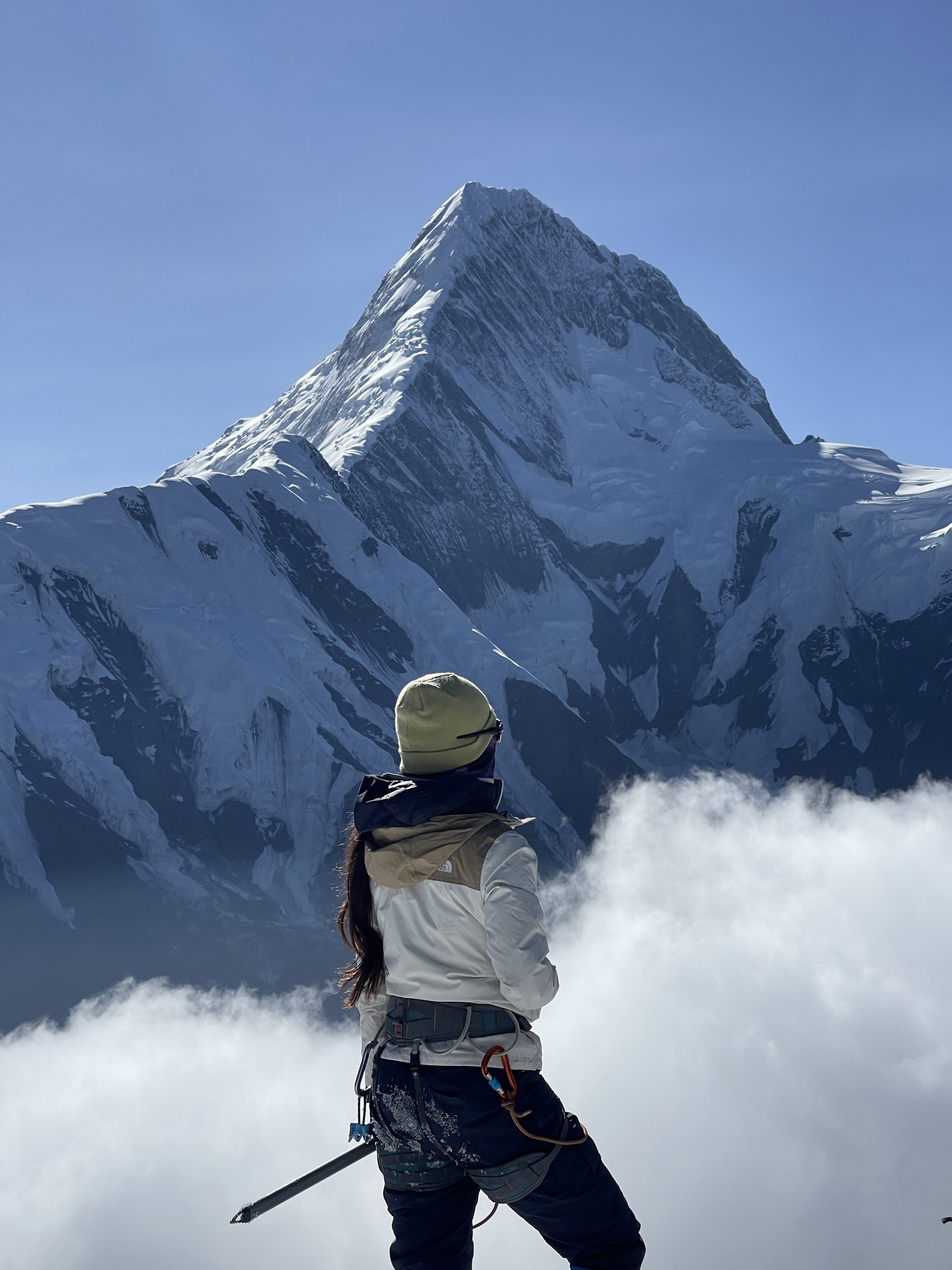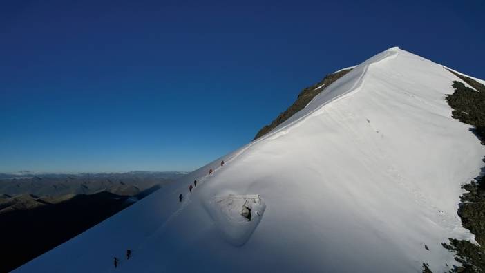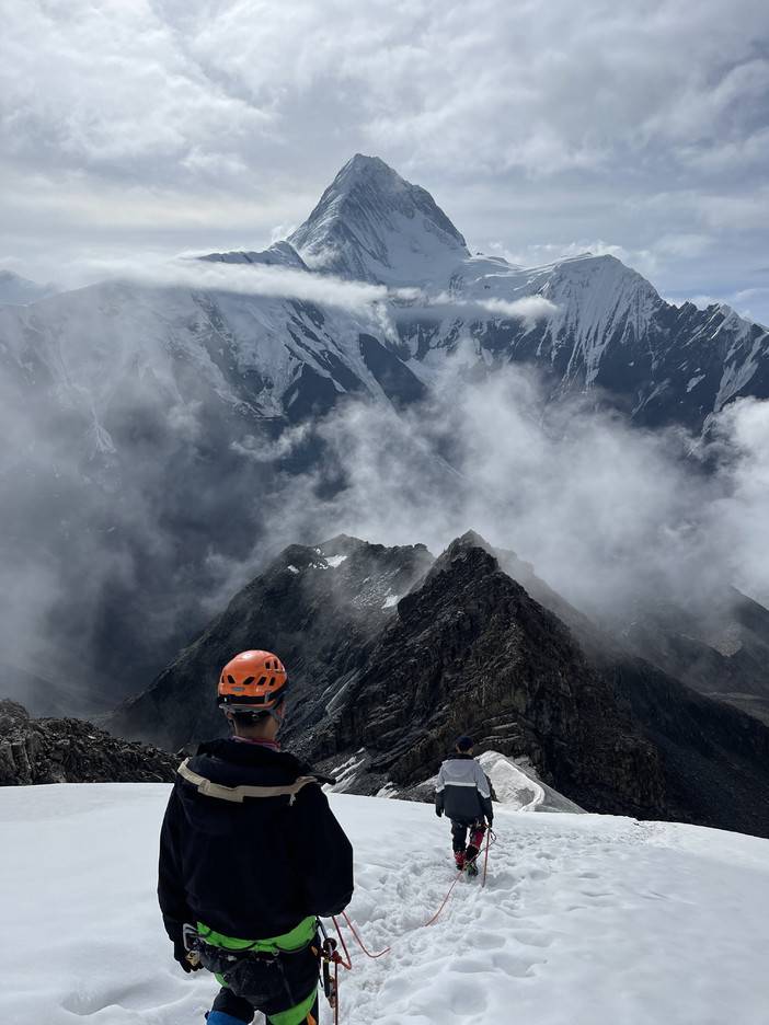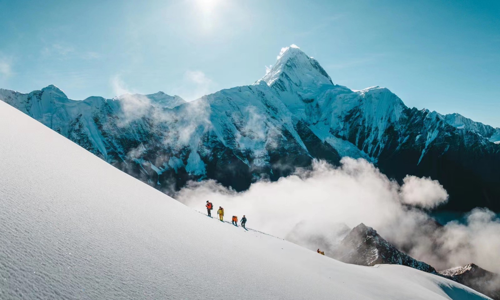协作会根据当时的气候情况和队员体力确定在凌晨2~3点出发,经过碎石坡到达5200m穿冰爪处,沿路绳到达冰川顶部,登上5588m顶峰,今天攀登全天的景色都非常好,12点之前登顶后返回大本营。继续下撤到子梅村。