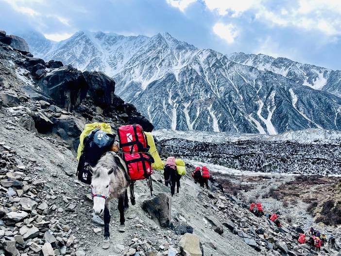 那玛峰进山路线较长,但自徒步开始直到冲顶,全程仅需背负备用衣物、食物、头灯、防晒等;仅冲顶日增加技术装备(安全带(锁、牛尾、下降器)、冰镐、头盔全程佩戴)。