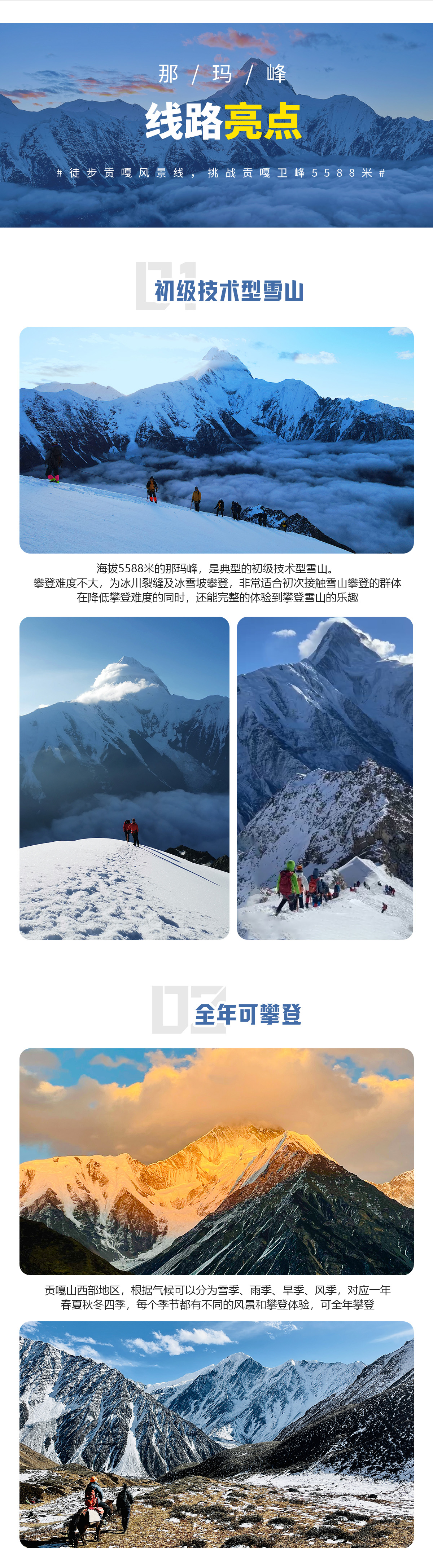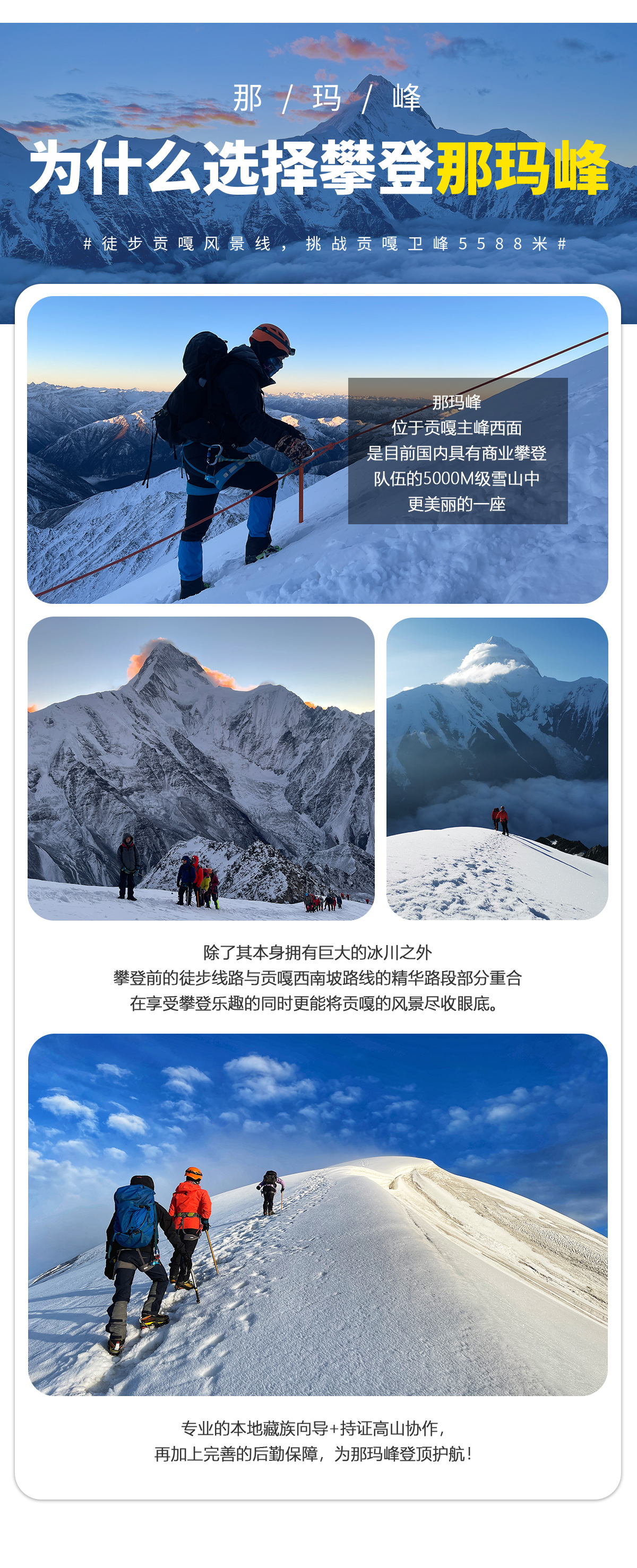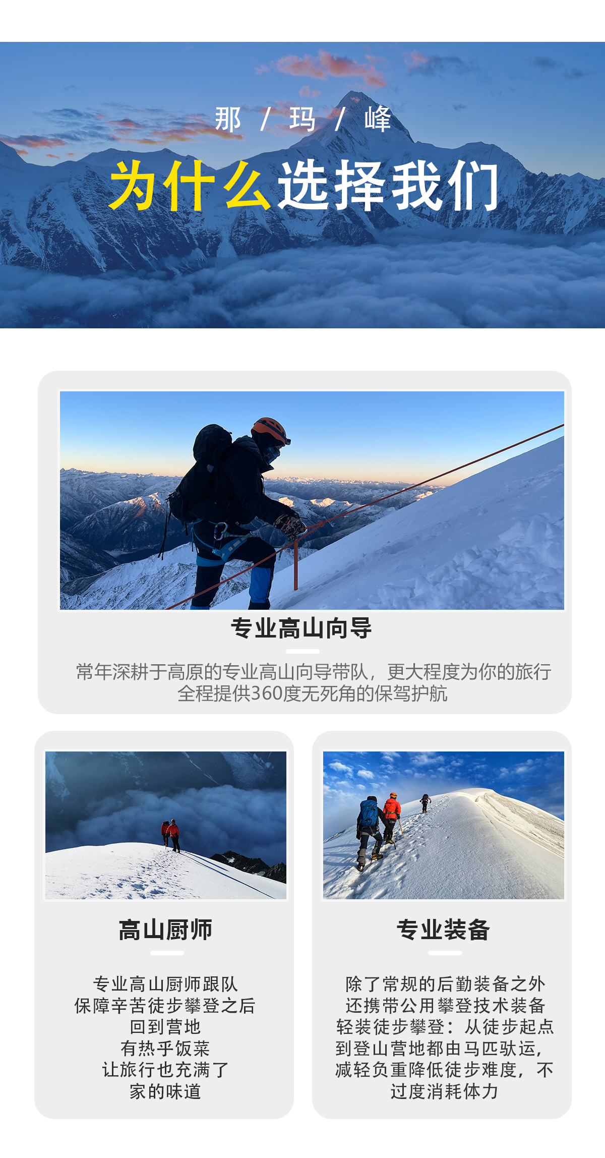 那玛峰攀登组队100余次,有专职且训练有素的高山向导带队攀登。5000-8000米高海拔专业攀登机构全程保障,在安全、提供优质服务和保证登顶概率的前提下,我们一直奉行“不做侥幸式登山”。
