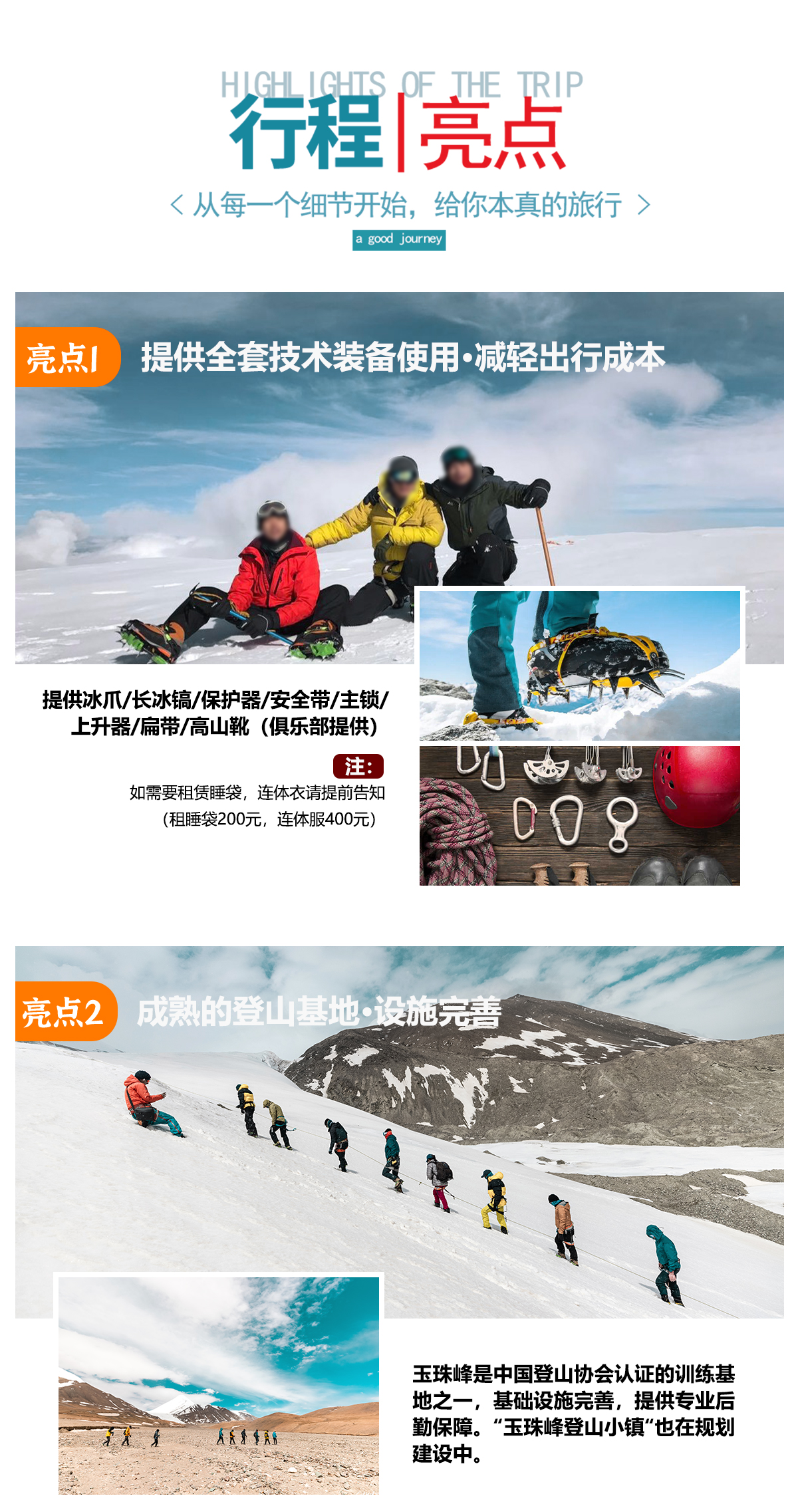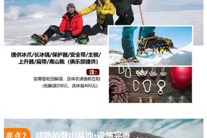 1、技术装备(安全带、主锁、8字环、冰爪)及高山靴租赁300元;