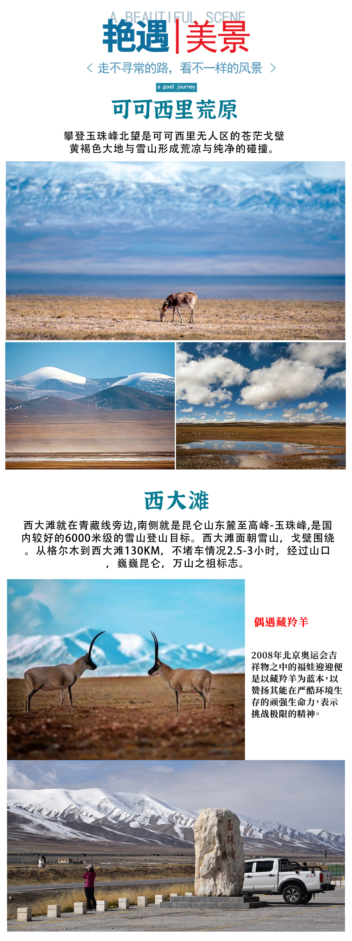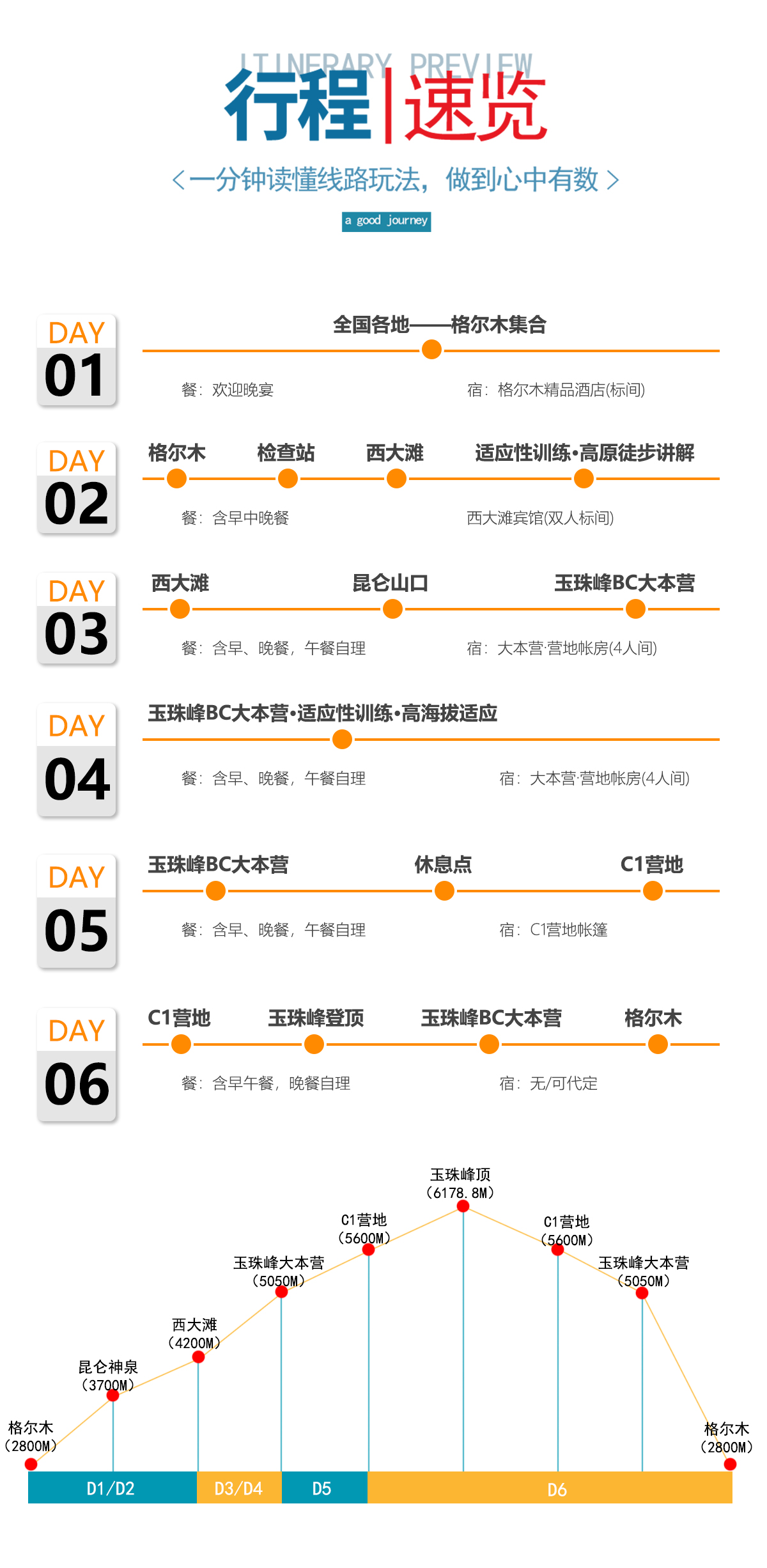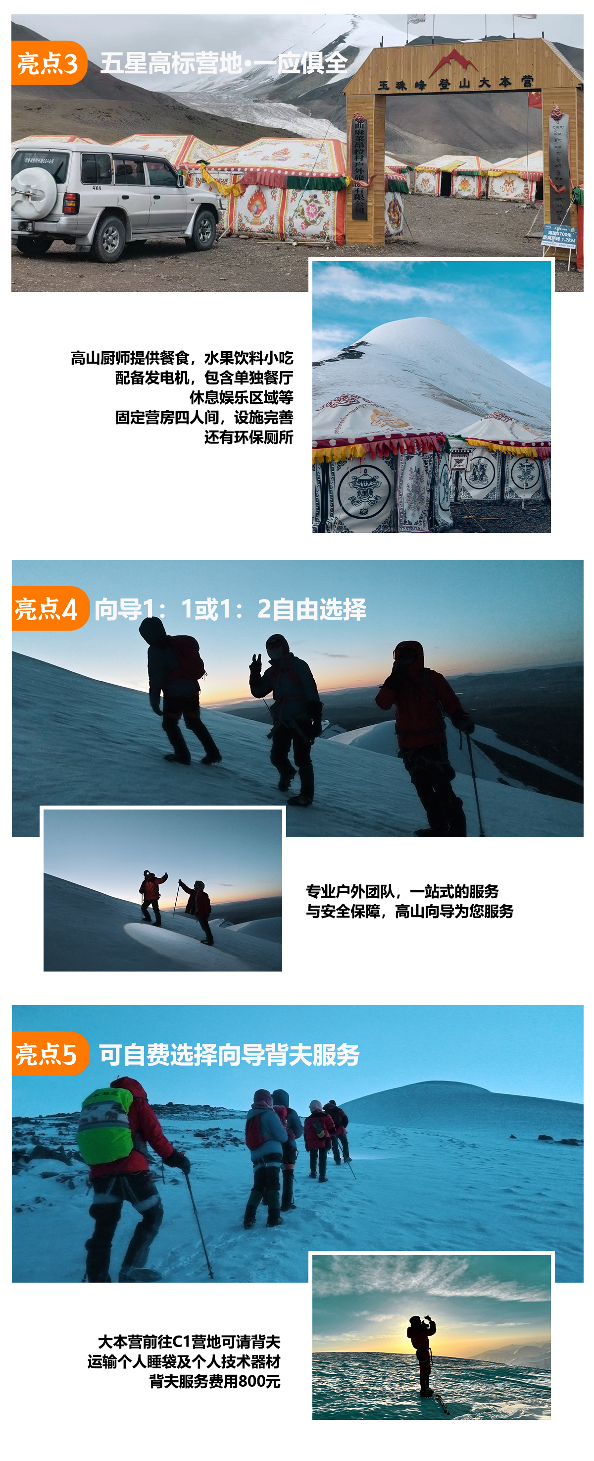 需时:冲顶2公里,预计5小时左右登顶,下撤大本营6小时左右,再乘车返回格尔木5小时。