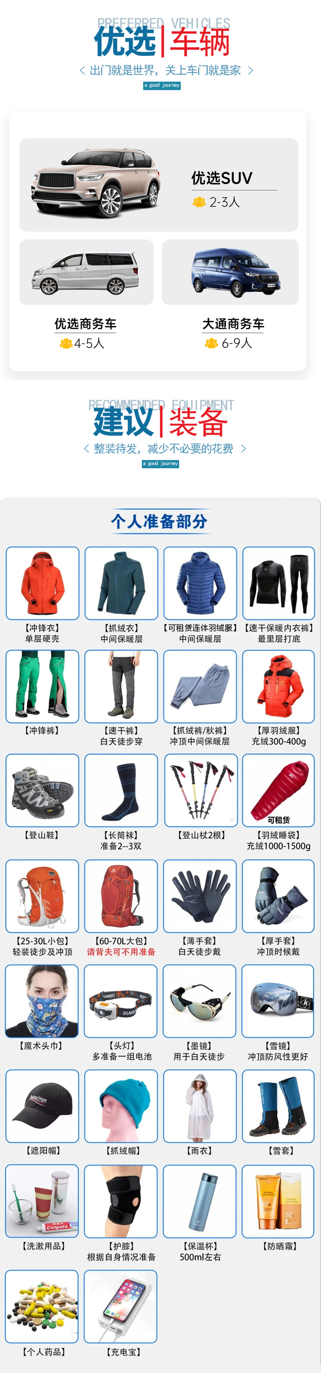 队员个人装备需要请背夫请提前告知,便于预定,费用800元,国庆节假日有变动,请咨询客服。