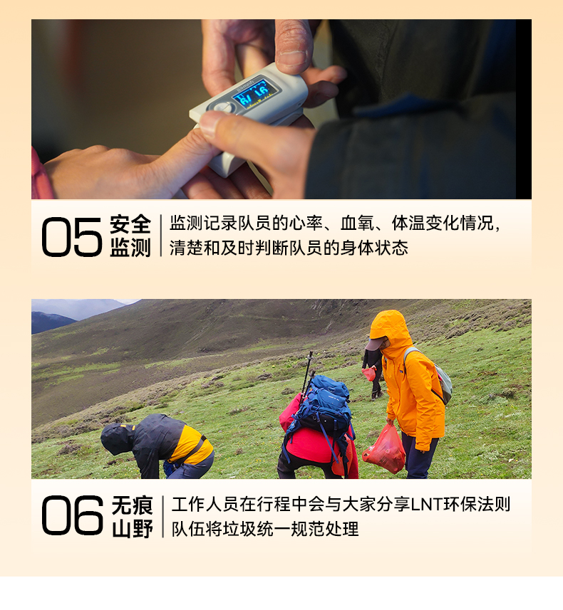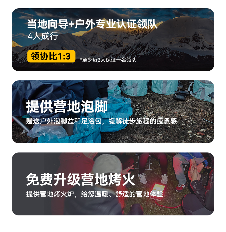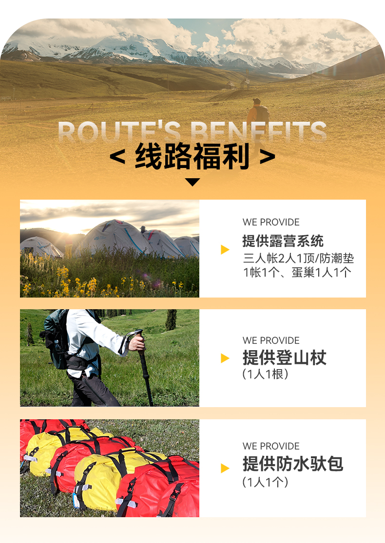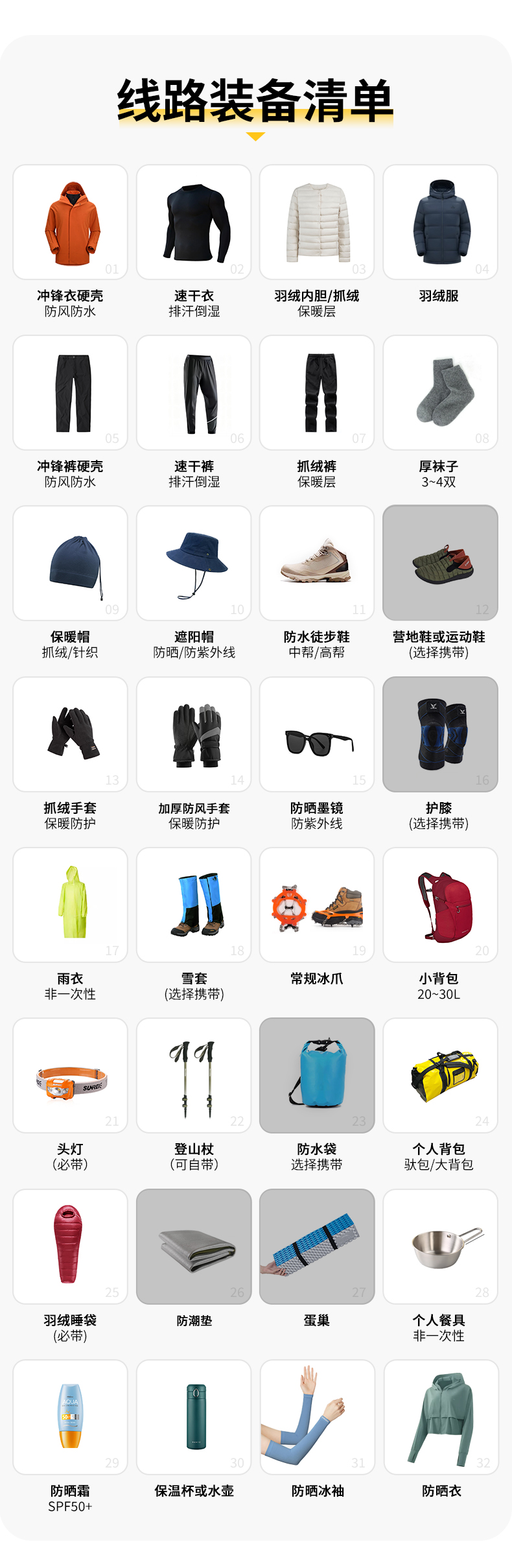 18.本次活动所到达的地区早晚温差较大,请大家注意携带保暖衣物,并请选择合适温标的睡袋(不清楚温标可以参考“活动装备”项目或咨询活动客服和领队)。高原紫外线强烈,请准做好防晒措施。