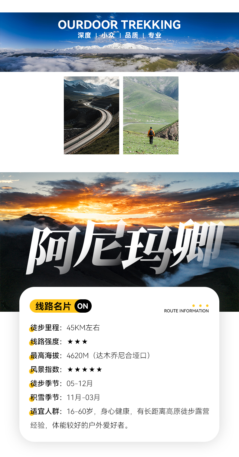 1.阿尼玛卿徒步活动不同于常规旅游团,重在全身心的体验,对参加队员的安全、体力、环保及团队协作精神要求较高。心若计较,处处都有怨言;心若放宽,处处都是春天。我们不歧视任何人,但建议以下人群请谨慎加入:偏执型人格障碍者、被迫害妄想症患者、完美主义者、抑郁者、自闭症患者。户外人人平等。严禁高姿态地将现实身份带进户外。