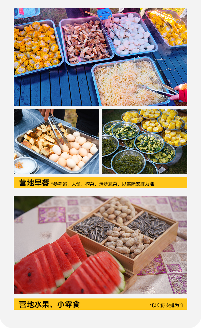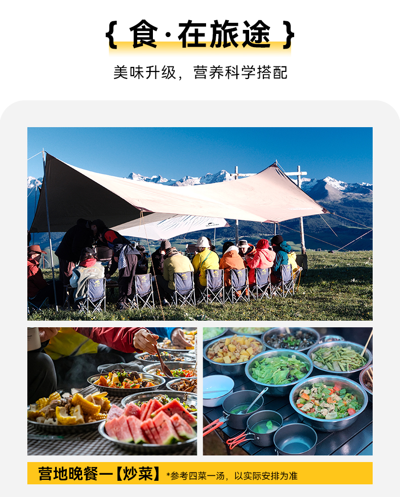 ▷ 餐食:早餐(含)午餐(自理路餐)晚餐(营地餐)