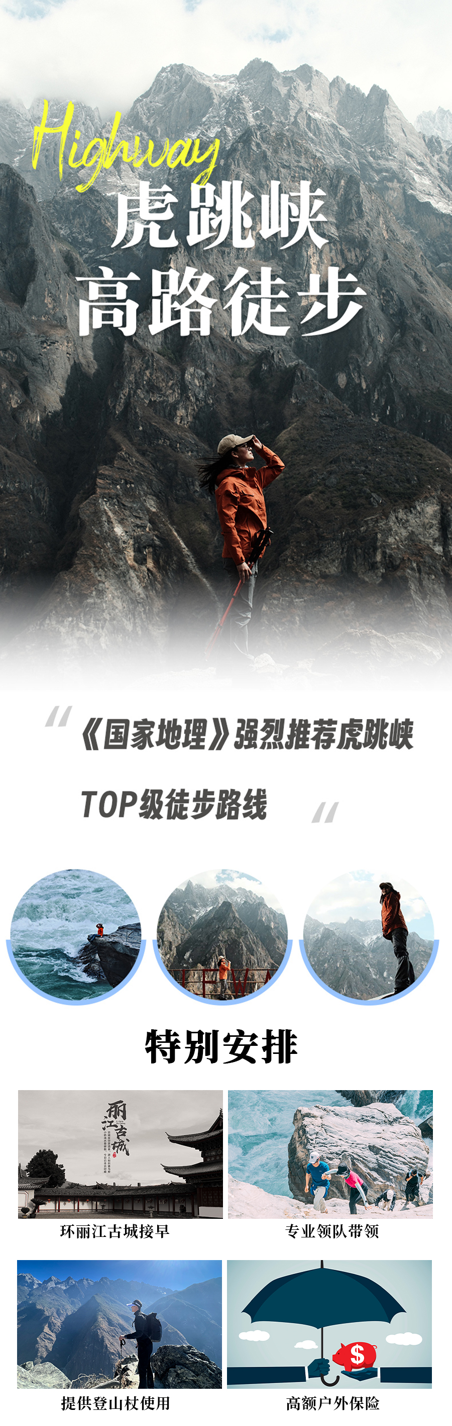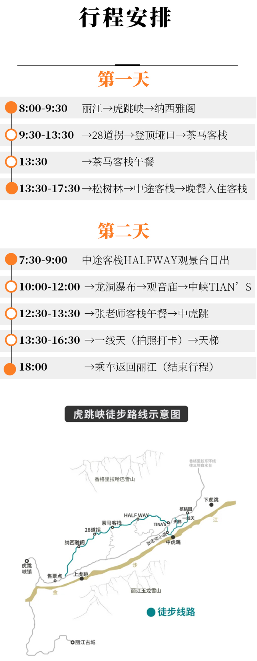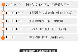早上8点左右客栈早餐后,经过龙洞水瀑布、观音庙,下坡至Tina's 中峡(3小时左右)中虎跳,一线天(徒步1.5小时左右),后进张老师客栈下中虎跳,(含午餐,再继续徒步至核桃园山白脸,乘车返回丽江,行程结束,预计到达丽江为下午6点左右,当晚若要赶飞机建议定晚上8点半后机票。