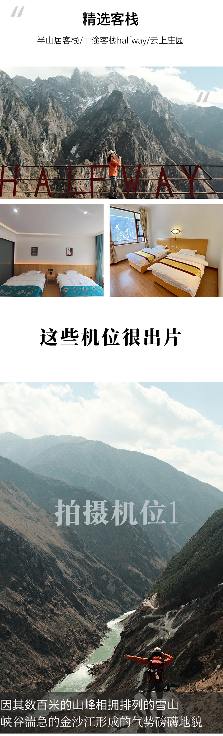 早上7点半或8点丽江出发,坐车到虎跳峡景区后,一路上坡到纳西雅阁,开始徒步28道拐,登顶垭口海拔2650米,到茶马客栈(中餐,中餐自理),休息后,一路到中途客栈或半山居客栈或其他同等客栈住宿。