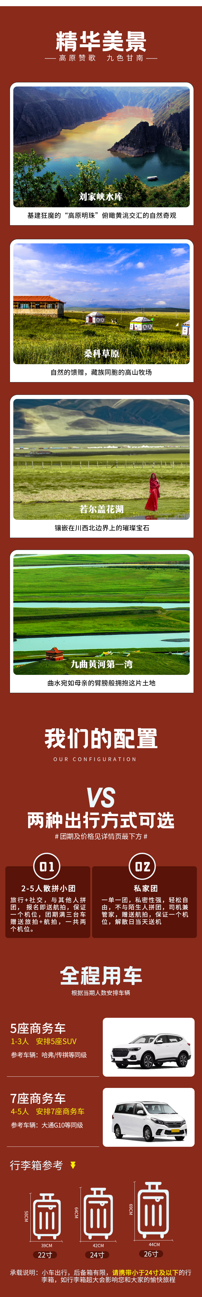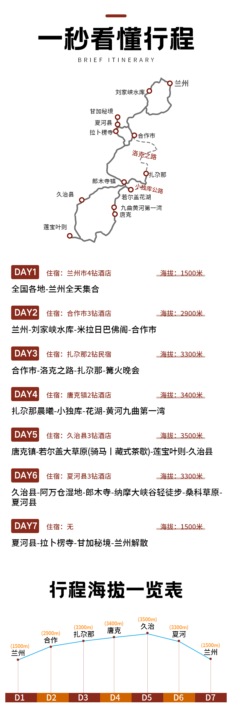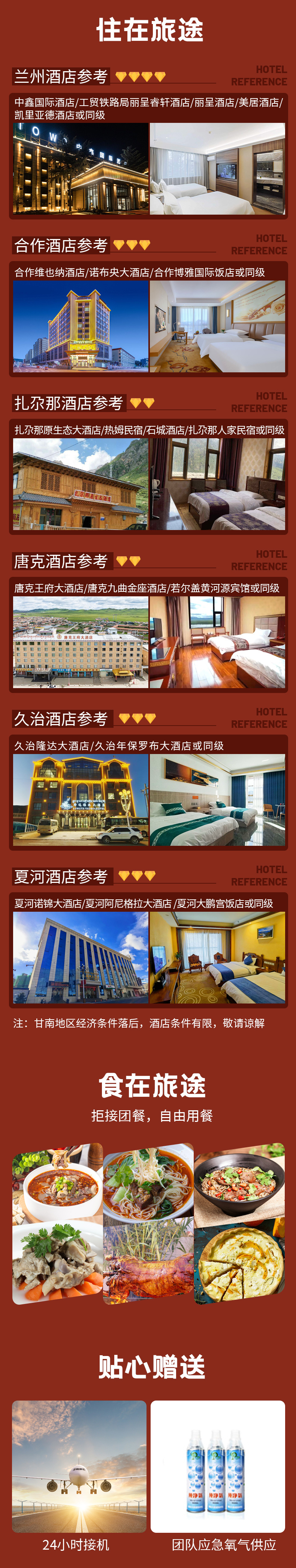 1、住宿:兰州4钻酒店标间1晚、合作市3钻酒店标间1晚、扎尕那藏式民宿标间1晚、唐克镇舒适型酒店标间1晚、久治县3钻酒店标间1晚、夏河县3钻酒店标间1晚