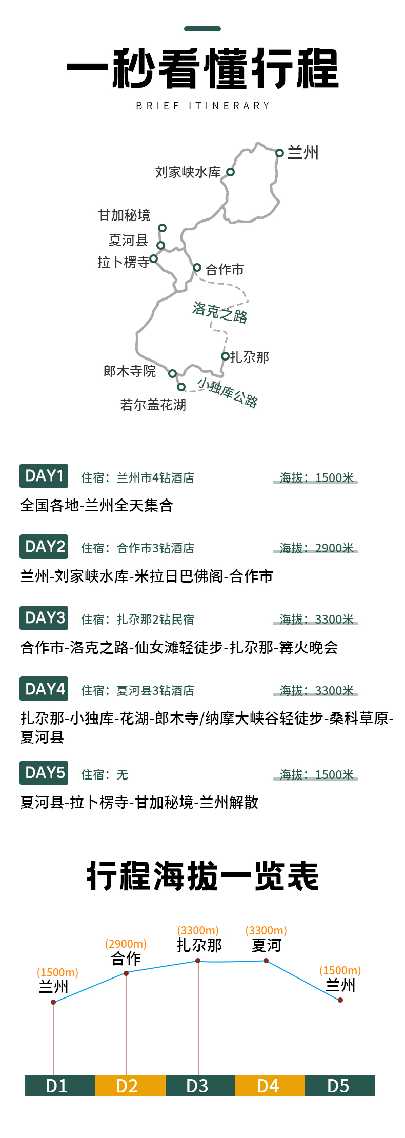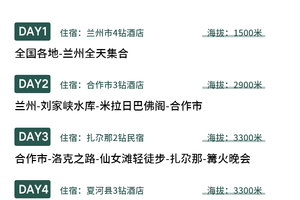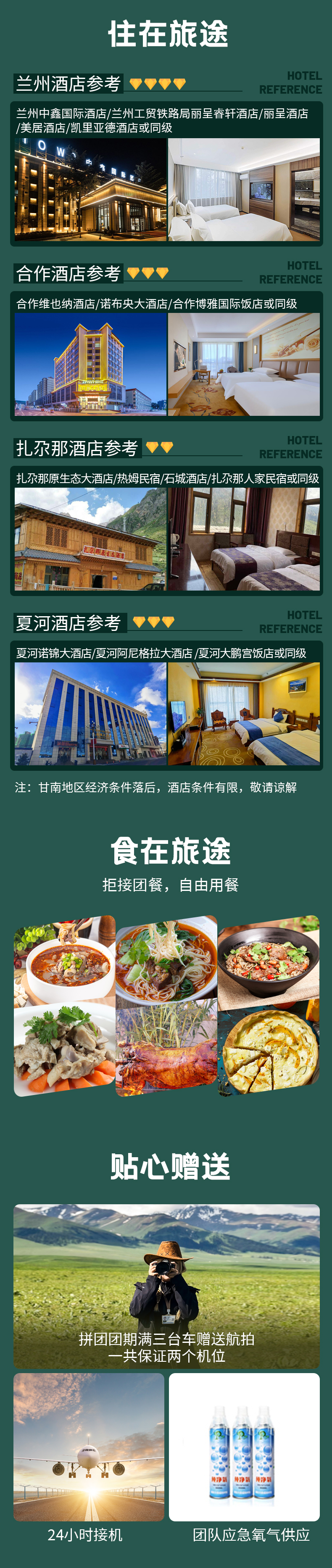 1.住宿:兰州4钻酒店标间1晚、合作市3钻酒店标间1晚、扎尕那藏式民宿标间1晚、夏河3钻酒店标间1晚