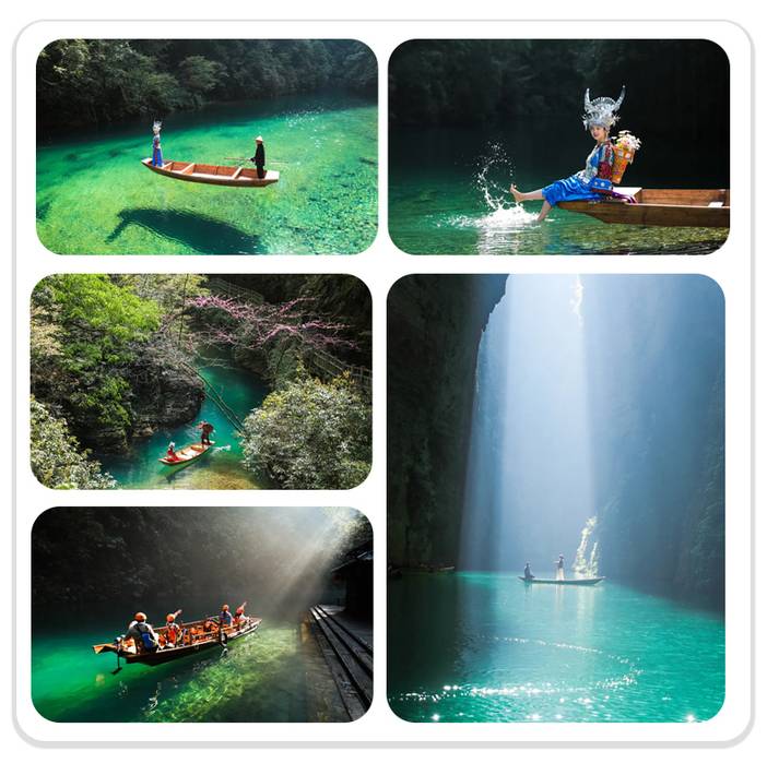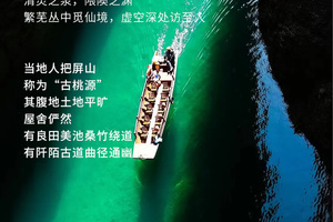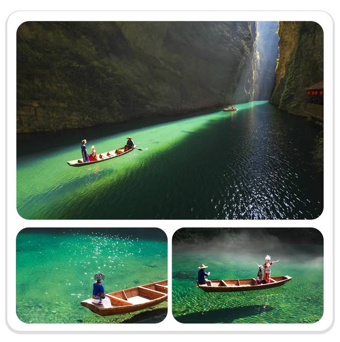屏山地形奇特,整体呈狭长弧形地势,四周峭壁耸立,碧水穿梭其中,清澈见底,船行河面恰逢一束阳光从峡谷上方洒下,在河面形成暗色投影,船只犹如悬浮在半空中。逢此天工美景,你脑补的我们都想到了,端坐在木船之上倾国倾城不倾船。作为一个真正的戏精,请时刻保持镜头感,来给个V,我保证看不出来是摆拍