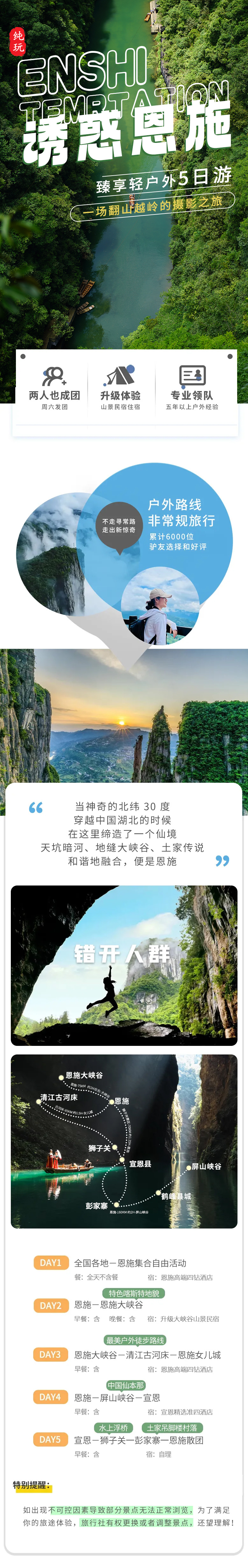 备用方案:如屏山峡谷景区遇天气原因或政府管制关闭的情况下,我们将行程调整至石门河景区,第四日酒店更改至:建始同级别酒店