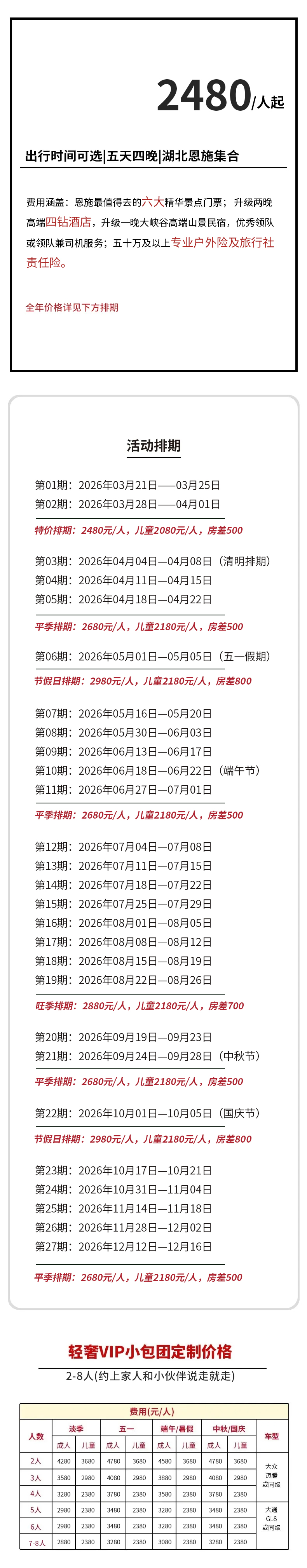 8-14人安排旅游大巴(单独领队+司机)