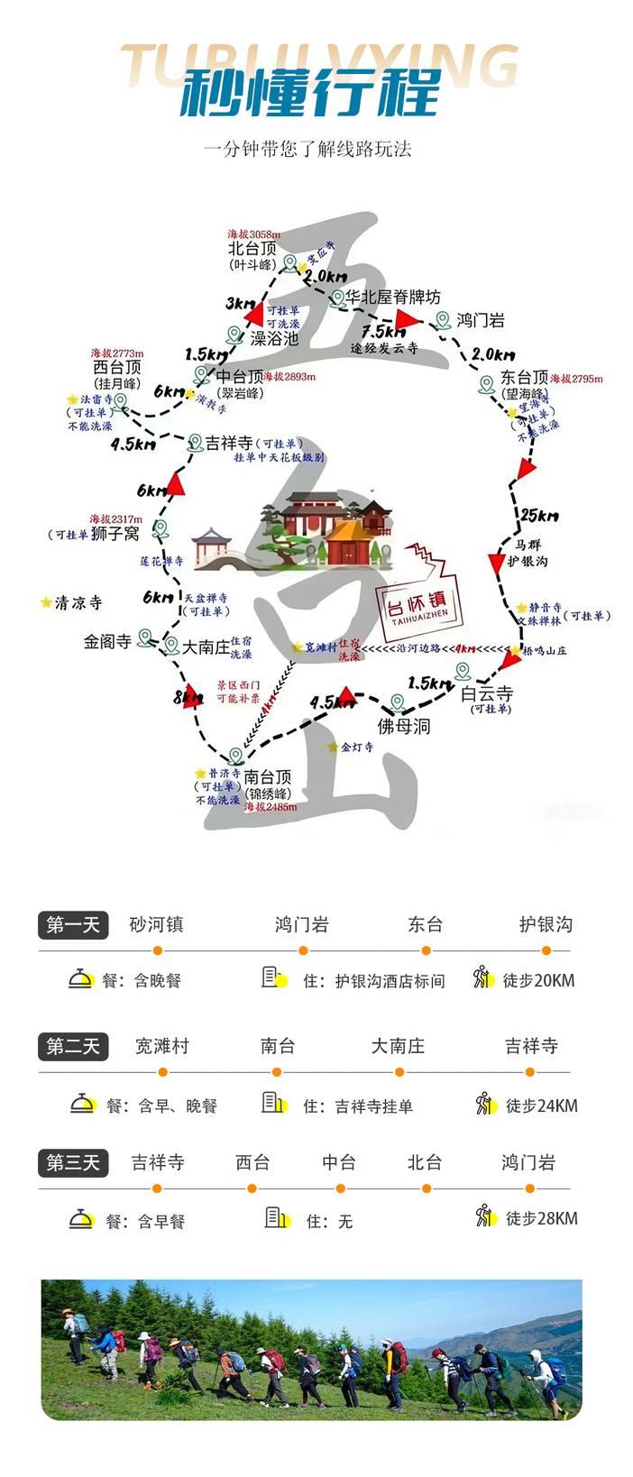 5-6点集合出发,开始徒步。根据天气决定是否能看日出!东台海拔2795米,可在东台望海寺看风景、朝拜聪明文殊,还能花10元盖章。之后从东台前往护银沟,徒步路程16公里左右,途经华坪垭口、山脊线和原始森林,路上中间段山神庙有补给,可以买水,中午自带路餐。此段为顺朝最艰难路段,建议使用登山杖节省体力。徒步约需7小时。晚上入住护银沟酒店。