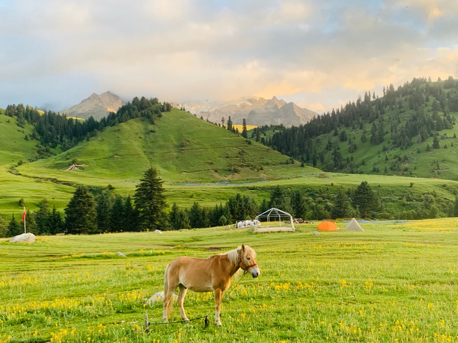 早餐后从然日卡村启程,这个隐于群山怀抱的藏族村落,晨雾缭绕间,藏式民居的炊烟袅袅升起,仿若世外桃源。告别宁静的村落,踏入新冷古寺的庄严领地,红墙金顶在阳光下熠熠生辉,诵经声与香火交织,带来心灵的沉静。冷古寺外就是虎皮坝,这里地势开阔,四周群山巍峨,草甸如绿毯般铺开,宛若世外桃源;随后继续向则巴村进发,在则巴村格聂主峰巍峨壮观,即使在夏季,也能清晰望见巨大的冰川。早晚时分,日照金山的景象令人陶醉,金黄色的阳光洒在雪山上,仿佛给山峰披上了一层金色的纱衣,美轮美奂。