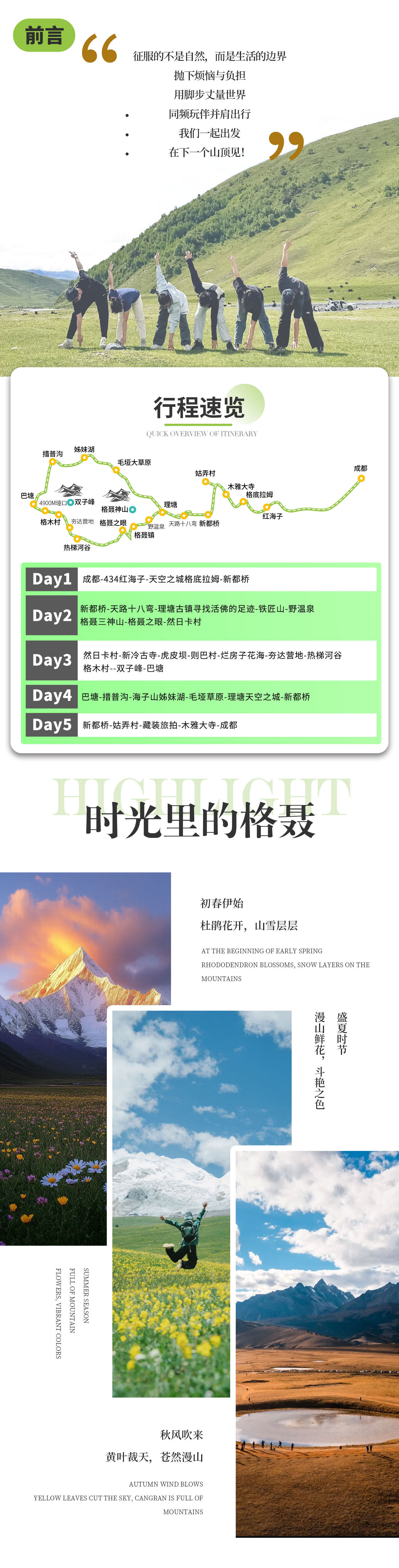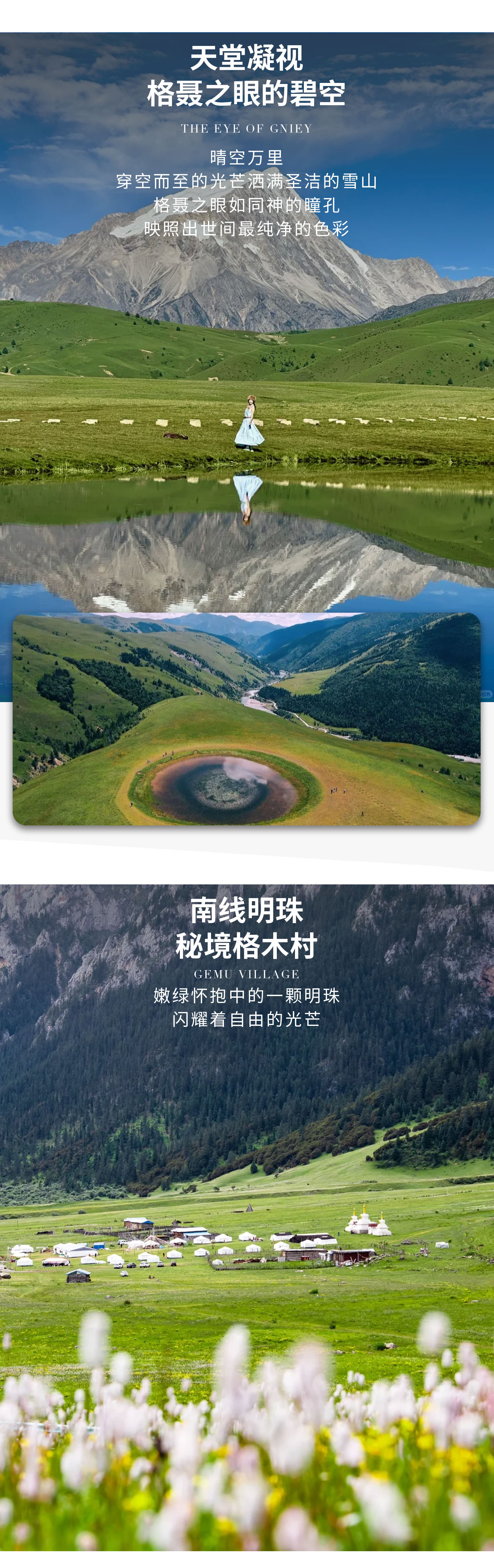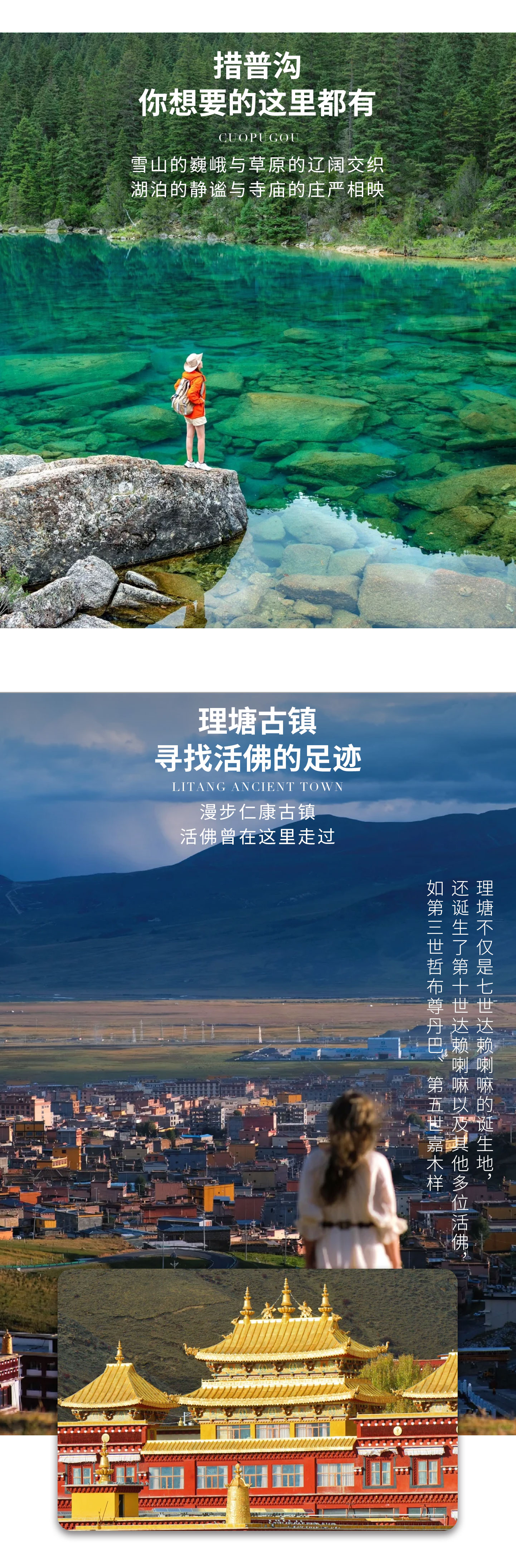 ■ 景区门票观光车自理,参考价格,具体的以实际为准:措普沟门票+观光车190元,格底拉姆卫生费30元,红海子卫生费15元,木雅大寺清洁费16元。由于格底拉姆道路条件有限,格底拉姆中转车60元/人,费用自理(原车师傅如愿意前往,也需补该费用给师傅)。格聂之眼进山费暂未收取,如产生需自理。付费景点如需陪同进入,需负责AA师傅门票等费用。