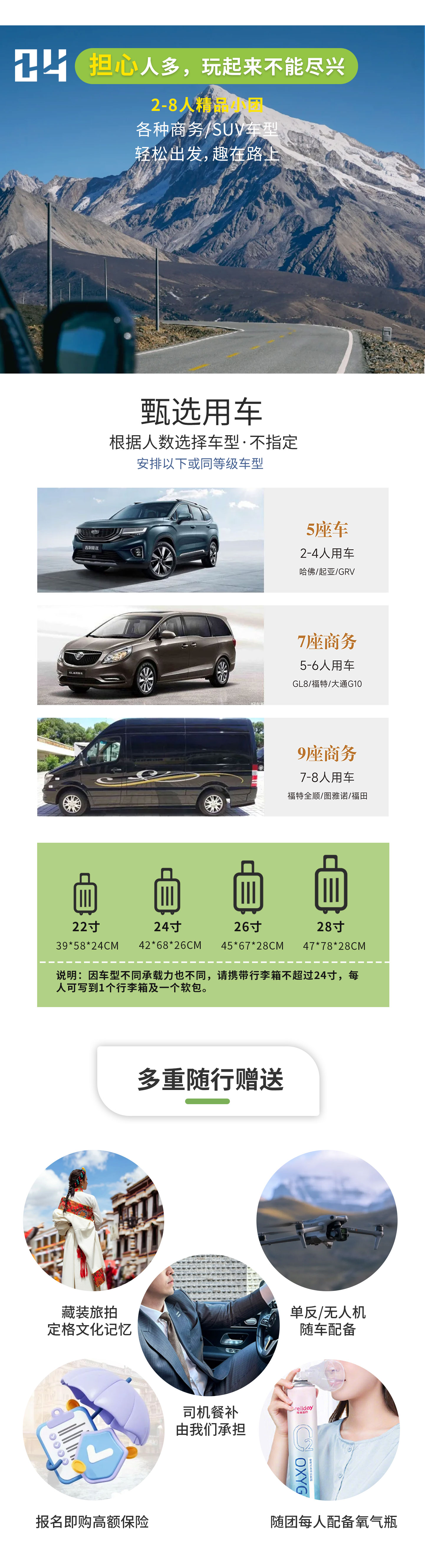 【活动赠送】 1、每人赠送1瓶氧气; 2、户外旅游意外险一份; 3、藏装旅拍1次(无妆造,拍5修3); 4、成都三环内(除东站)上门接早(三环外的游客需要赶到三环内集合地点); 5、随车单反或无人机(仅提供随车设备,无专业拍摄;节假日不承诺随车设备); 6、师傅餐住补贴;