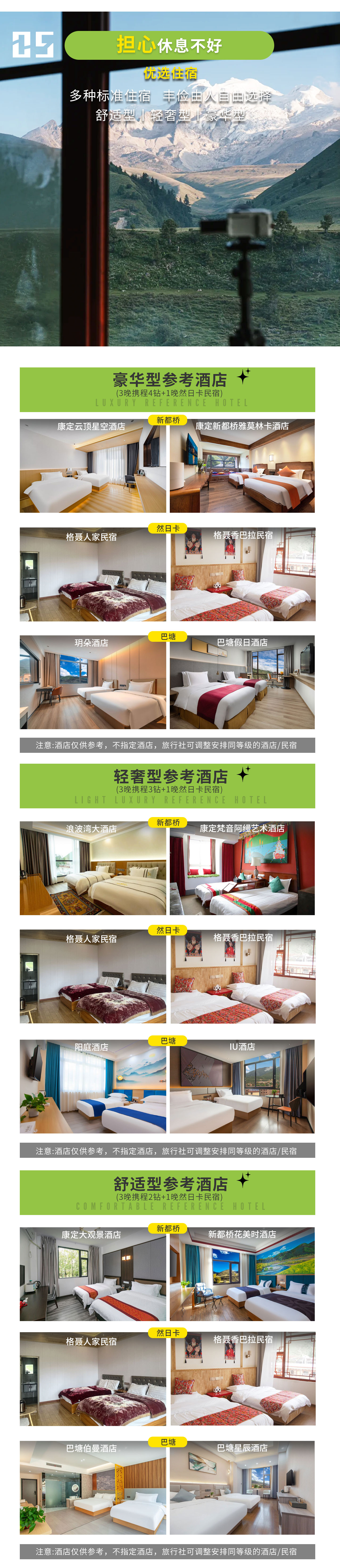 ■ 所列3晚酒店+1晚然日卡民宿住宿,藏区条件有限,住宿标准不可与城市相比较, 建议自带洗漱用品,如对住宿要求高建议选择高标准住宿套餐 ;
