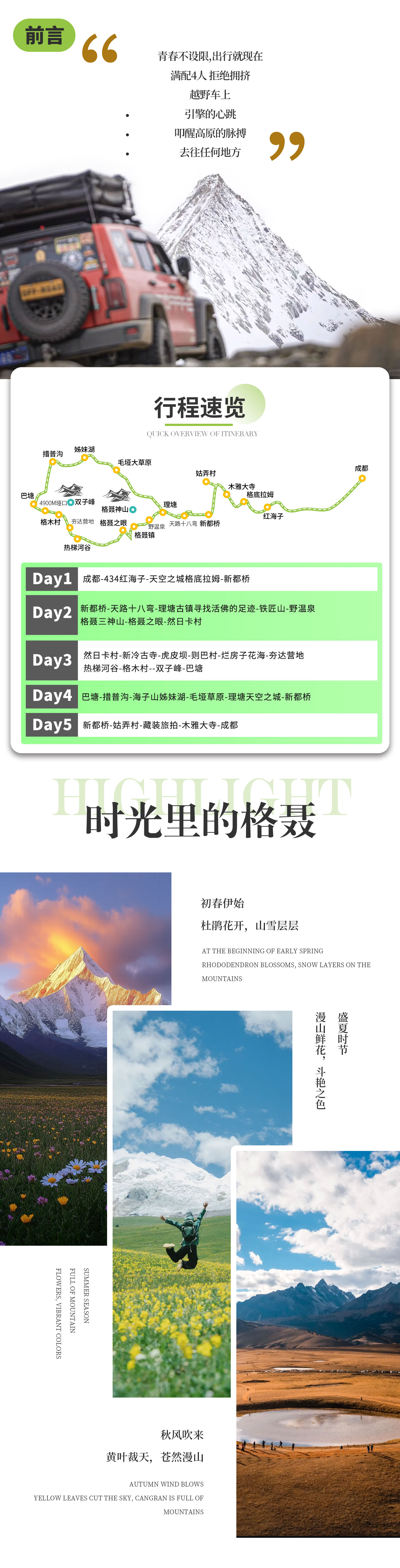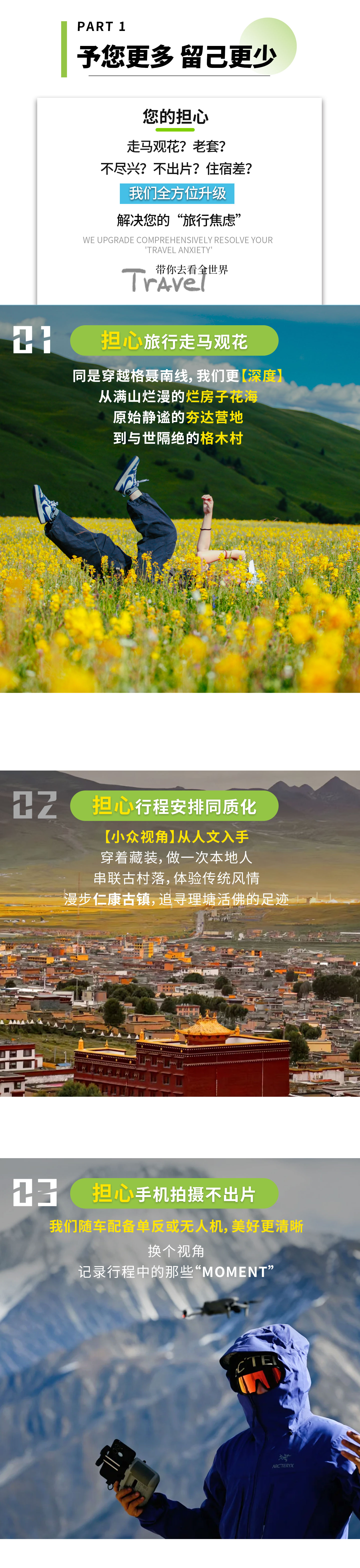 3、如格底拉姆拆迁、堵车或者天气原因等导致无法前往,替换为鱼子西,中转车费用自理,参考价格60-80元/人(原车师傅如愿意前往,也需补该费用给师傅)。如鱼子西也无法前往,则安排扎真、新都桥观景台等同类型观景点,如产生中转车费用,需自理。
