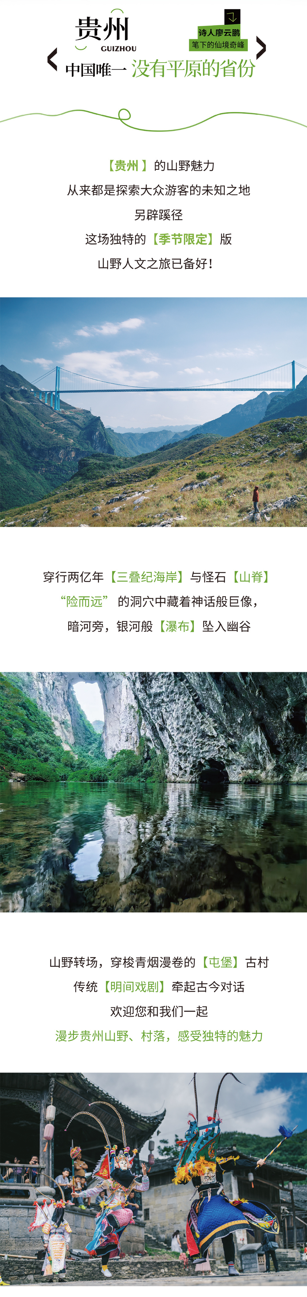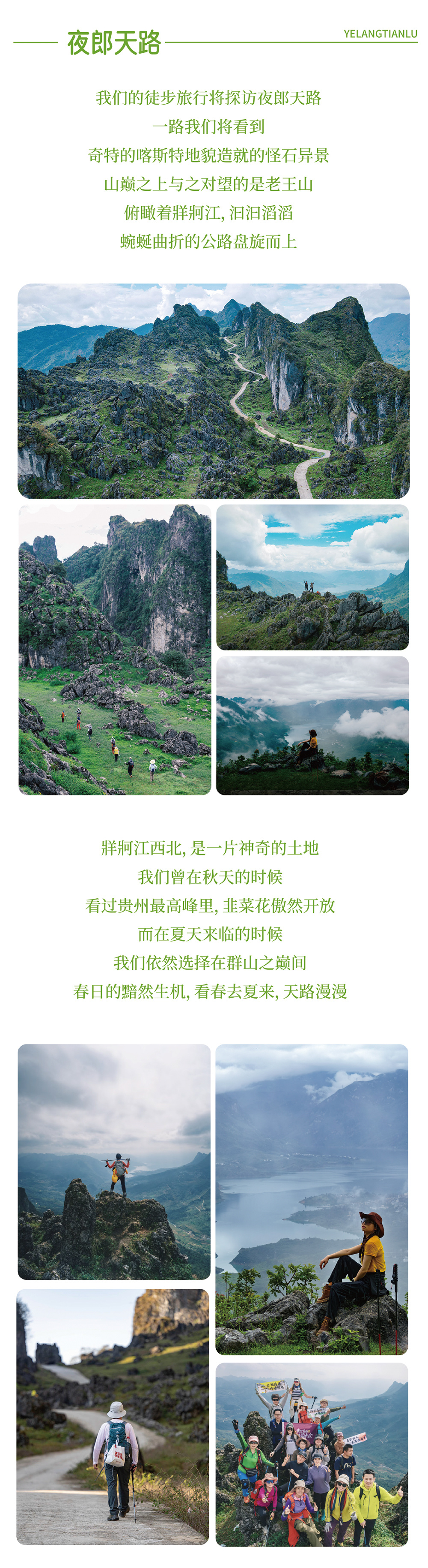早餐后乘车前往夜郎天路,从山脚的乡道开始徒步,穿越村落、山脉、一路沿着羊肠小道爬升至海拔两千多米的龙脊山顶,沿途眺望牂牁江和老王山做伴。登顶后沿着“异域星球”般的山峰继续前行、拍美照凹造型。