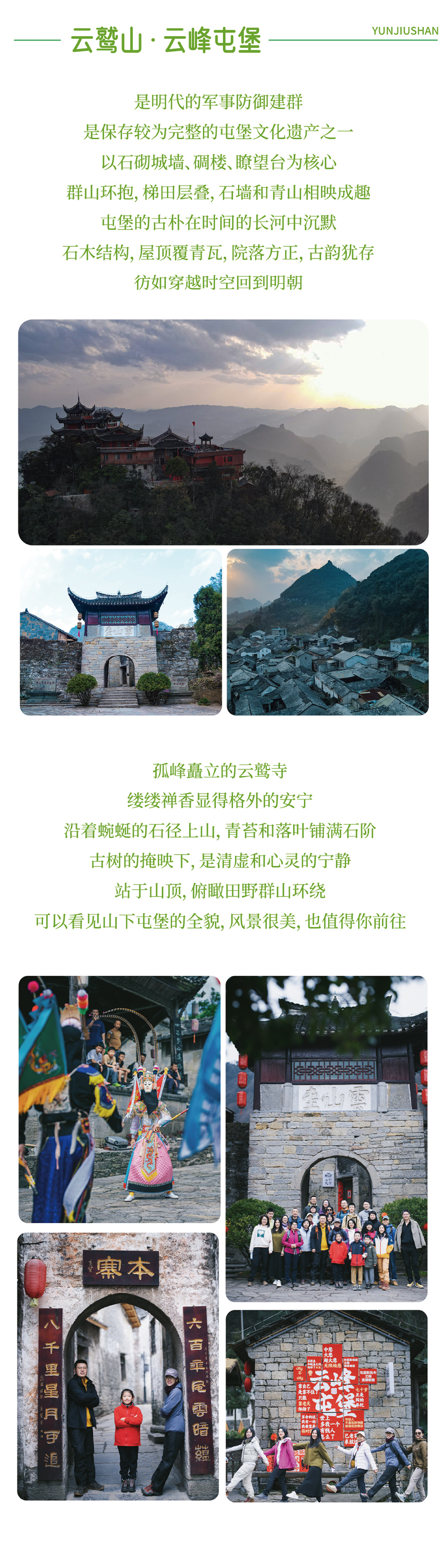 早餐后乘车前往云峰屯堡,走进600年的古寨,欣赏贵州“八怪”之一的石头当瓦盖,登云鹫山寺祈福、一览众山小;穿越玄祖洞前往本寨屯堡,古寨打卡,参观游览古宅大院,了解屯堡文化,走进屯堡人的生活场景,感受一场人文盛宴之旅。在本寨自由解决午餐或集体聚餐庆功宴,后乘车返回贵阳,送站/送机,行程结束。