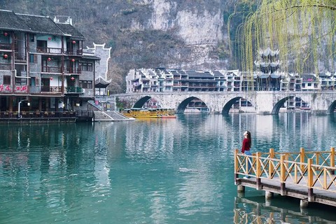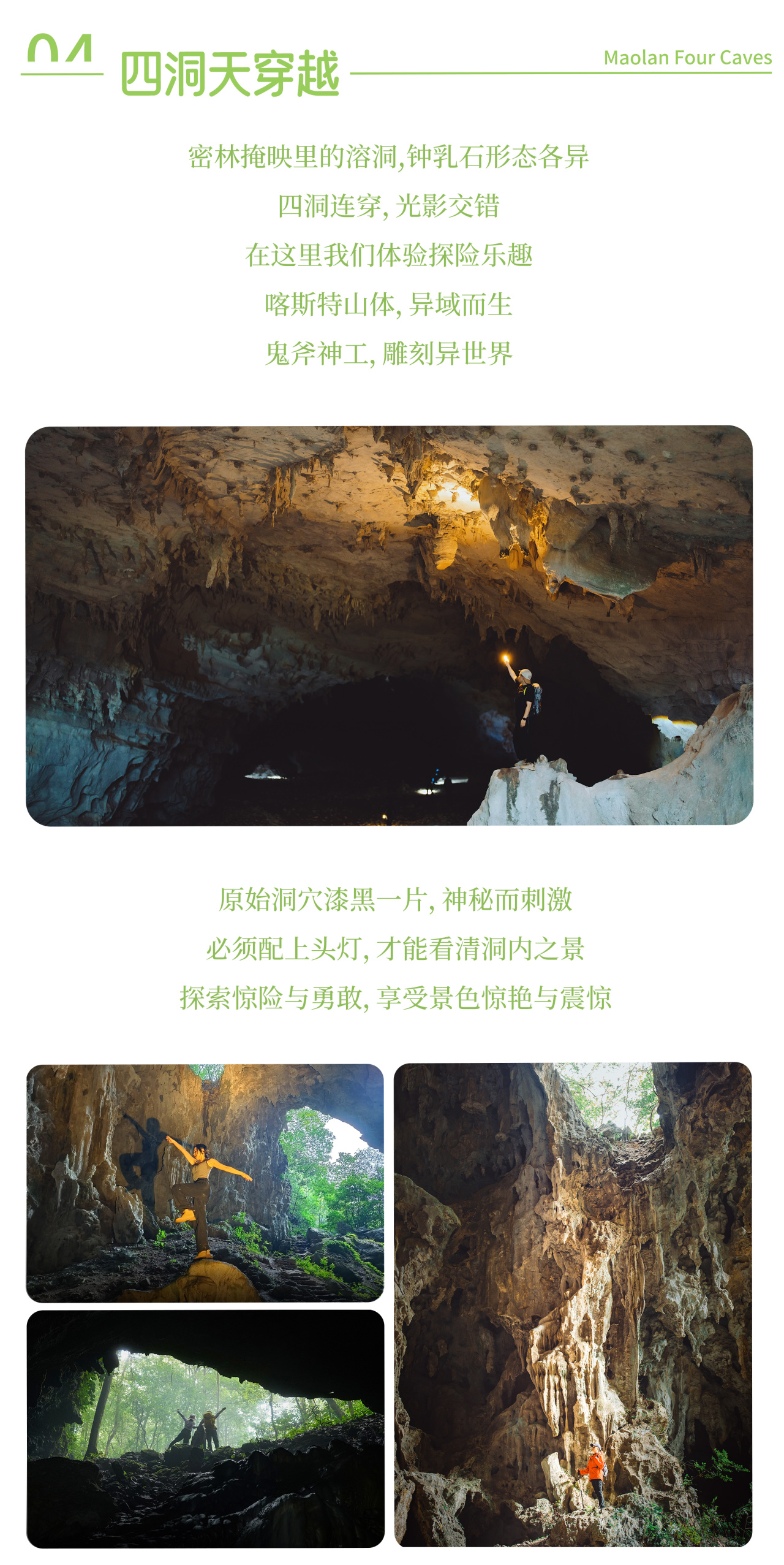 早餐后穿越喀斯特地貌的典型景观-四洞天,行走一段“黔桂古道”之后进入原始的洞穴里穿越,溶洞内钟乳石奇异,光影绰约;林深处植被繁茂,日光斑驳,鸟鸣悦耳。一路仿若与自然对话,尘世烦忧皆抛。