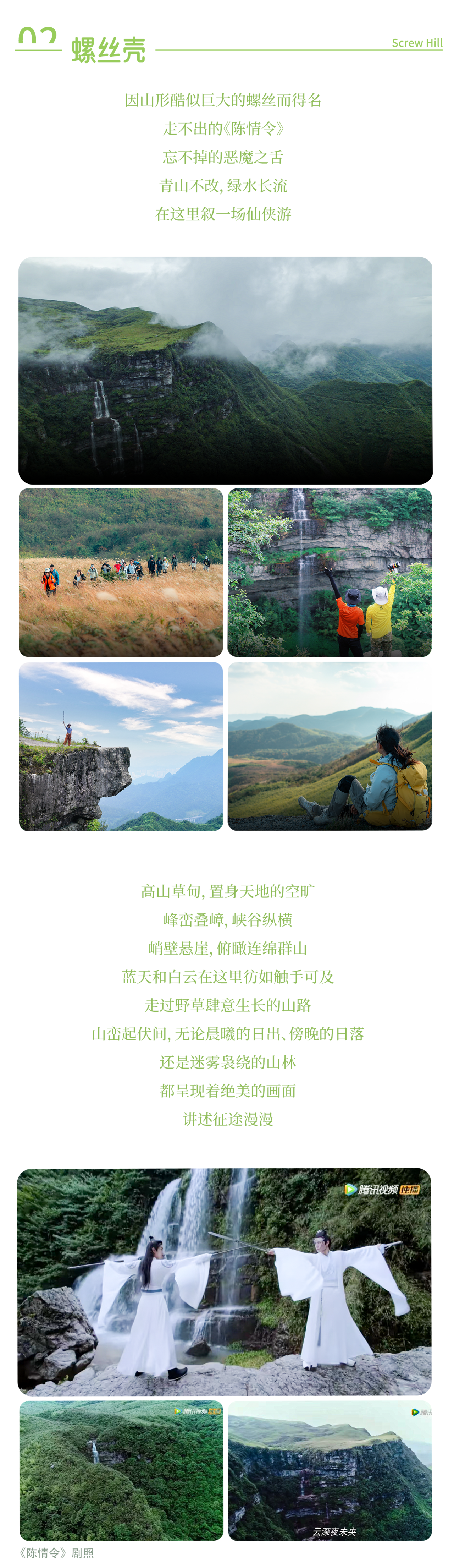 早餐后乘车出发旅程的首个秘境——螺丝壳高山草甸,打卡《陈情令》拍摄地;热身后徒步下至一个不知名却十分壮观的瀑布,随后穿越高山草甸至鹰嘴岩,这里的视野十分开阔,也特别适合出片,随后环线徒步回到起点乘车前往都匀市入住酒店,