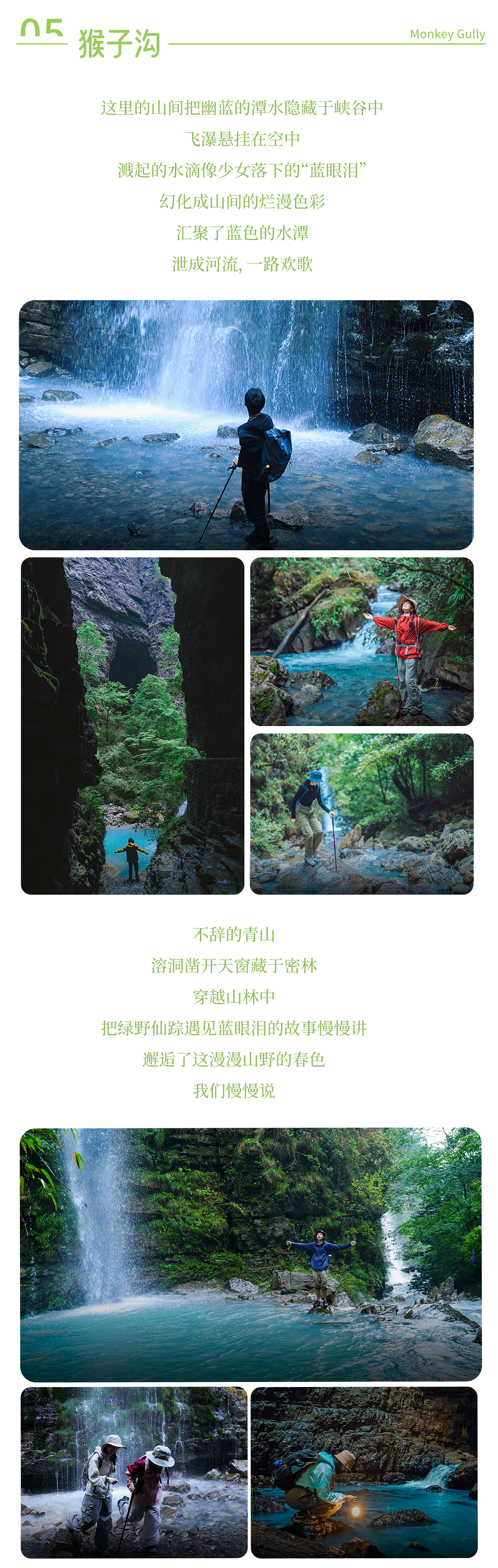 ① 今天的徒步路程约11公里,爬升350M/下降290M,以峡谷、溪流、瀑布风为主,需要走草甸、峡谷河床和走一些乡道。在4-10月时需涉水,需带一双溯溪鞋或可更换的鞋子以及多备一套衣服可以更换。