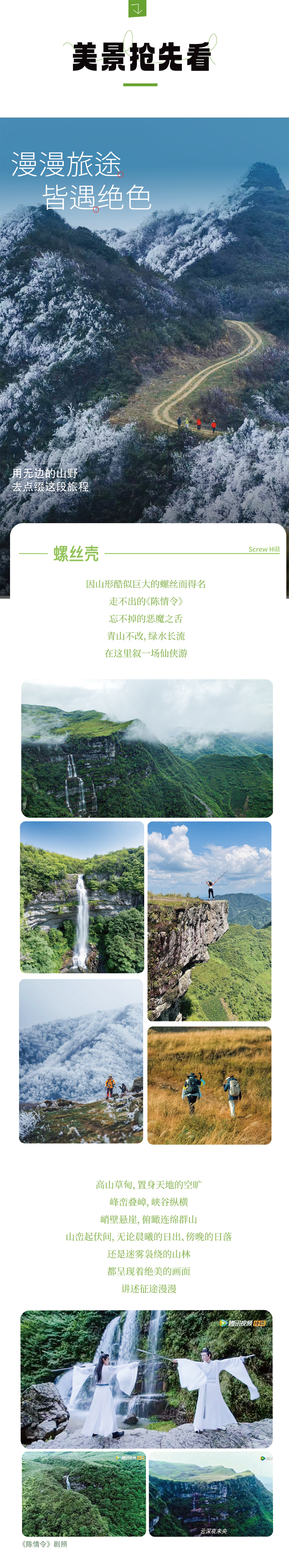 早餐后乘车出发旅程的首个秘境——螺丝壳高山草甸,打卡《陈情令》拍摄地;热身后徒步下至一个不知名却十分壮观的瀑布,随后穿越高山草甸至鹰嘴岩,这里的视野十分开阔,也特别适合出片,随后环线徒步回到起点乘车前往都匀市入住酒店。晚上自由打卡西山大桥、石板街、品尝当地特色美食等。
